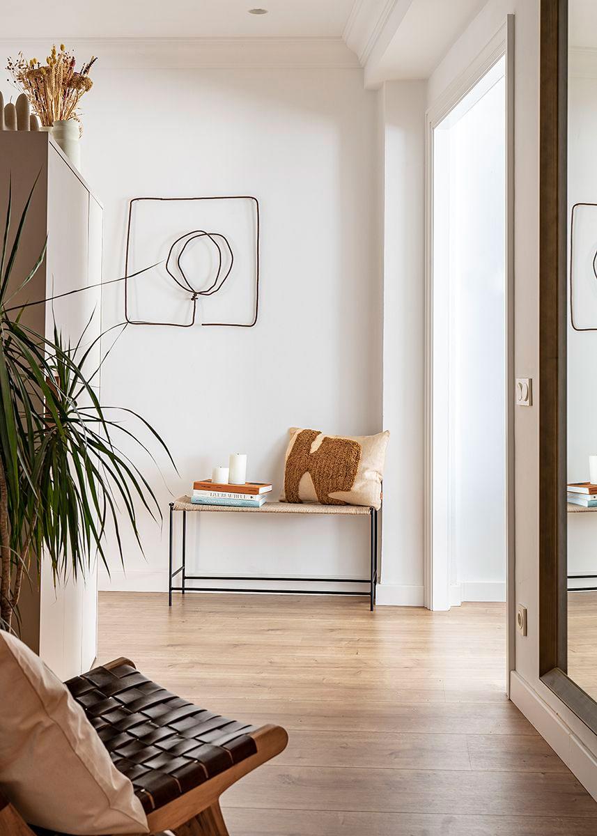 El interiorista encontró una casa donde predominaba el blanco en sus paredes, tenía un precioso suelo de roble de lamas anchas y una luz que lo inundaba todo (al estar en un sexto piso, sobre todo el salón y el dormitorio, disfrutaban de mucha luz natural), todas estas características hacían de esta vivienda un buen punto de partida para empezar a darle una nueva imagen. Necesitaban buscar el equilibrio entre los muebles que ya tenían los propietarios y otros nuevos de corte moderno, como así lo solicitaron ellos.
