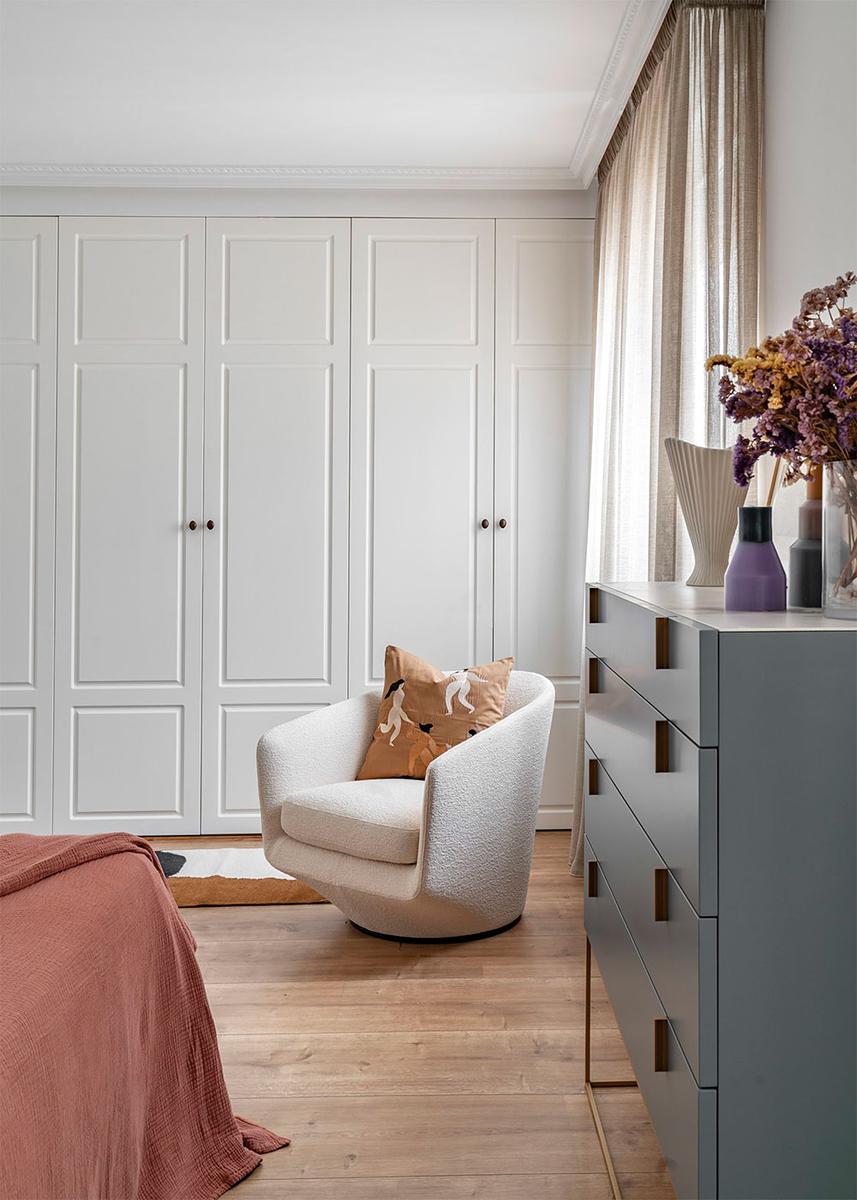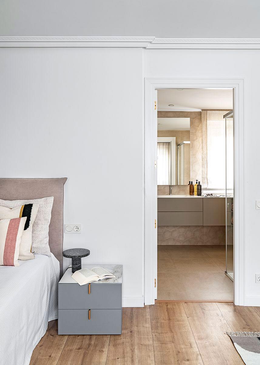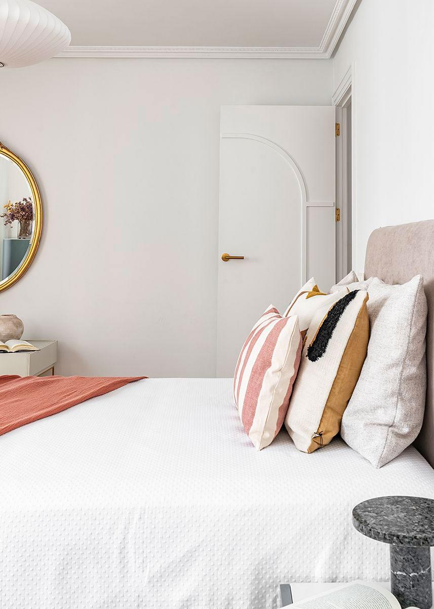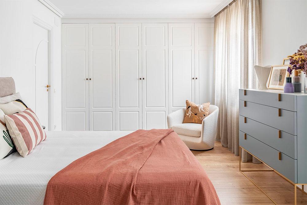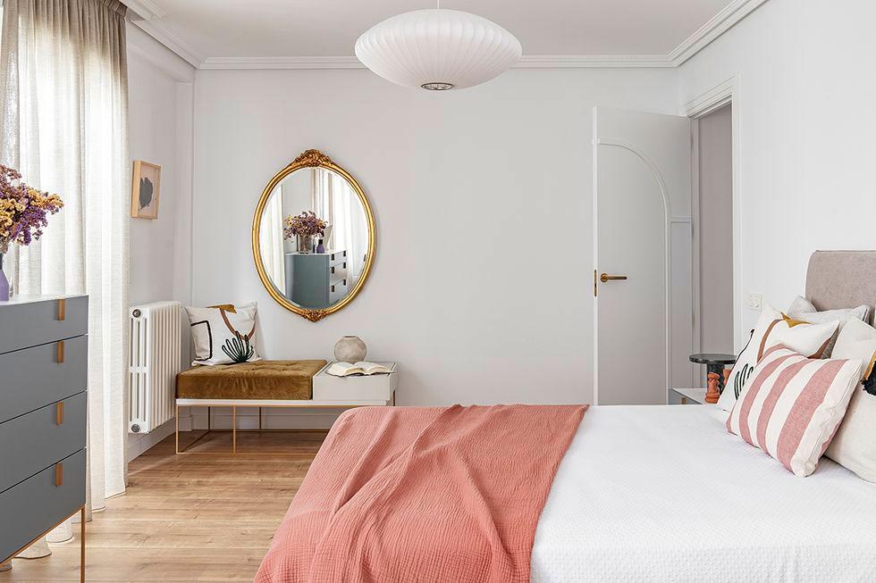 Finalmente llegamos al dormitorio principal. Se conservaron los armarios empotrados a los que simplemente se les cambiaron los tiradores. La cama y el cabecero ya lo tenían los propietarios, así que el interiorista decidió introducir más color a la estancia con la cómoda, las mesillas y algunos textiles. Particularmente me encanta el rincón donde se ha colocado una descalzadora con un espejo dorado sobre ella.