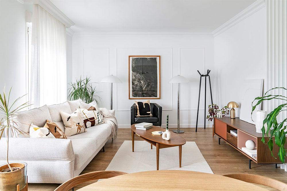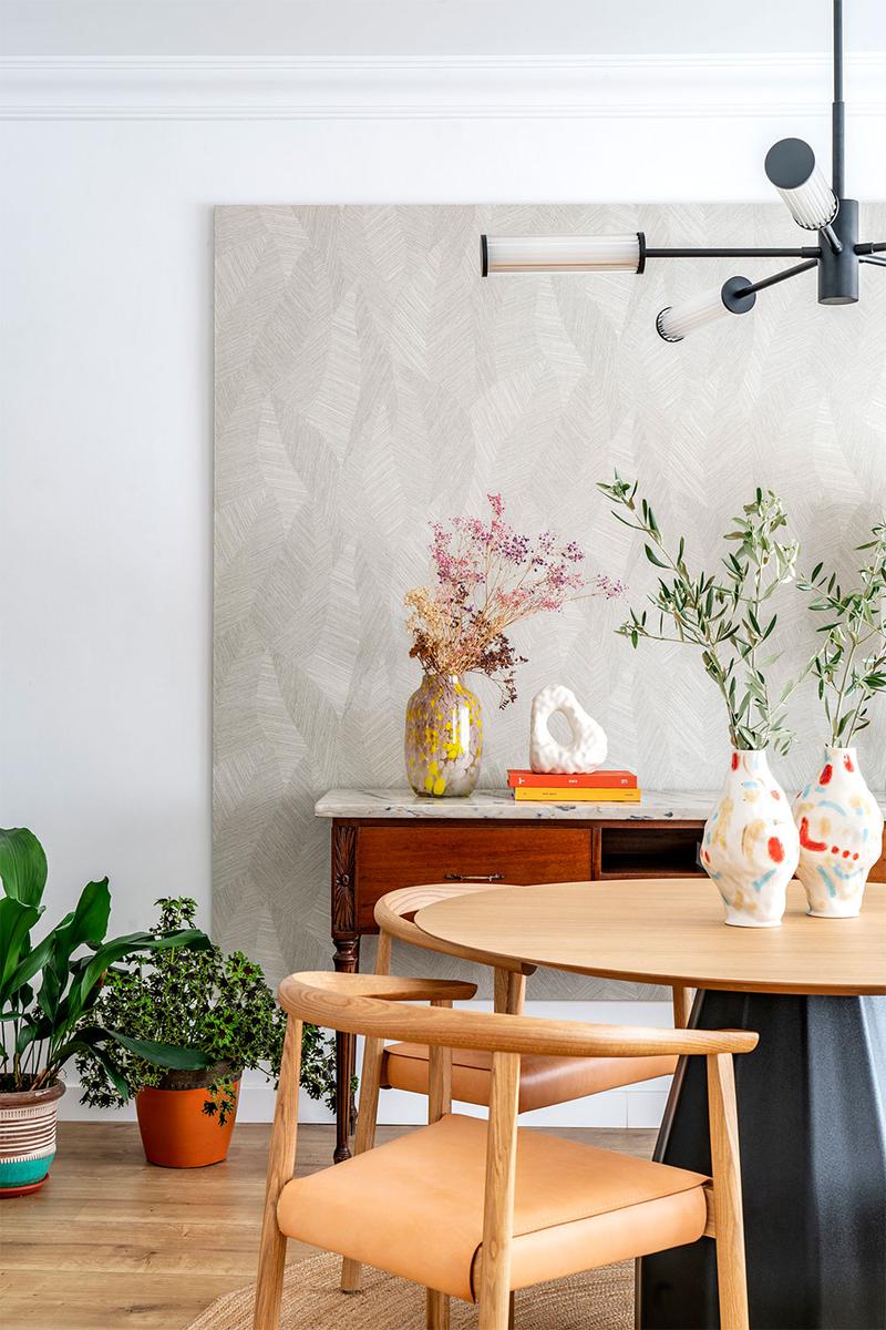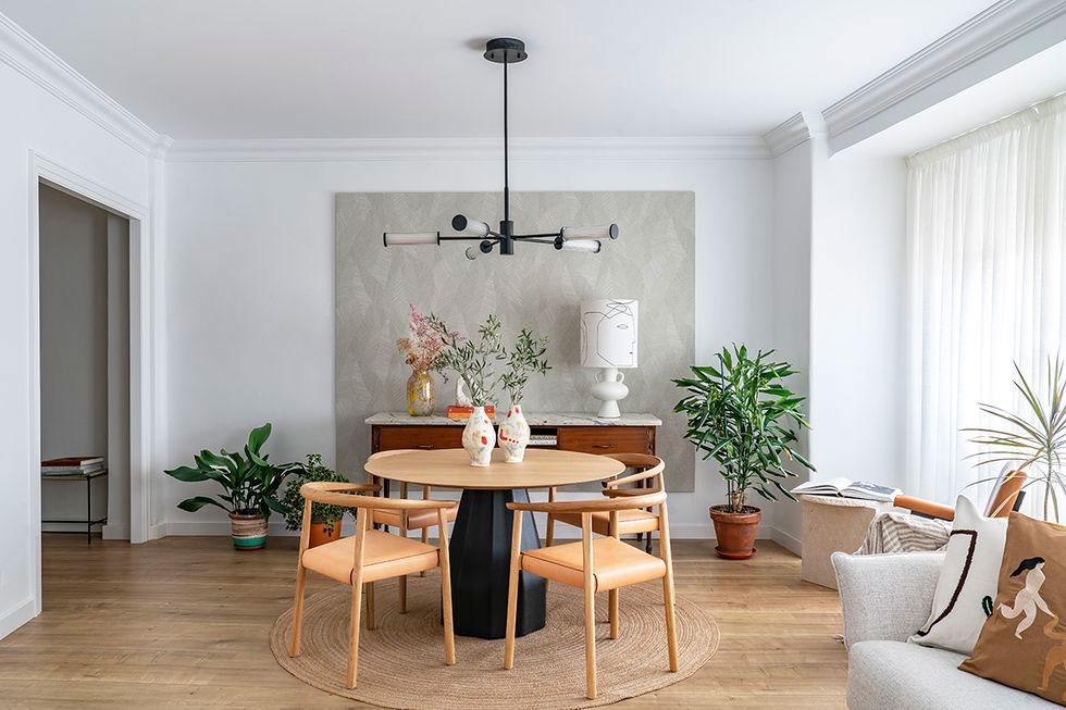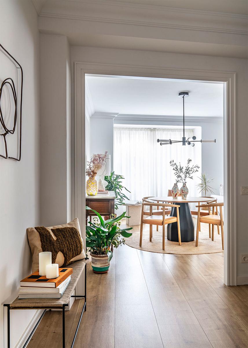 Del recibidor se accede directamente al salón y aprovecha su luz natural. Lo primero que encontramos es el comedor, donde se han mezclado los muebles e iluminación nueva de esta zona, con el aparador que apoya contra la pared ya existente en la casa. También aquí, el estudio de interiorismo ha creado otra pieza exprofeso para los clientes. Sobre el aparador luce un gran tablero de madera revestido con papel pintado. Una solución que servía por un lado como elemento decorativo y por otro, era una manera de disimular la curvatura de dicha pared donde les era imposible colgar nada. Junto al segundo ventanal, se encuentra la zona de estar. De nuevo las paredes se llenan de detalles, revestimientos como las molduras o el diseño de palillería, las realzan y les aportan elegancia y dinamismo.