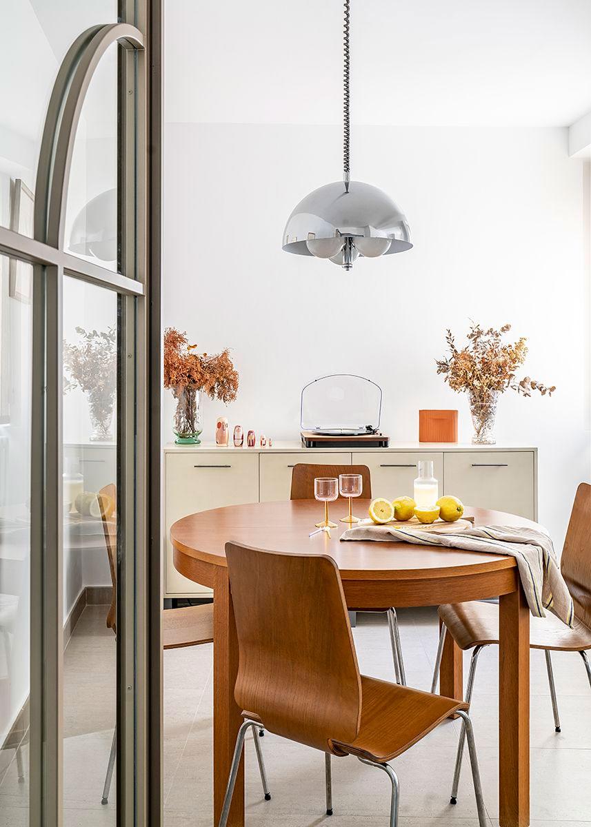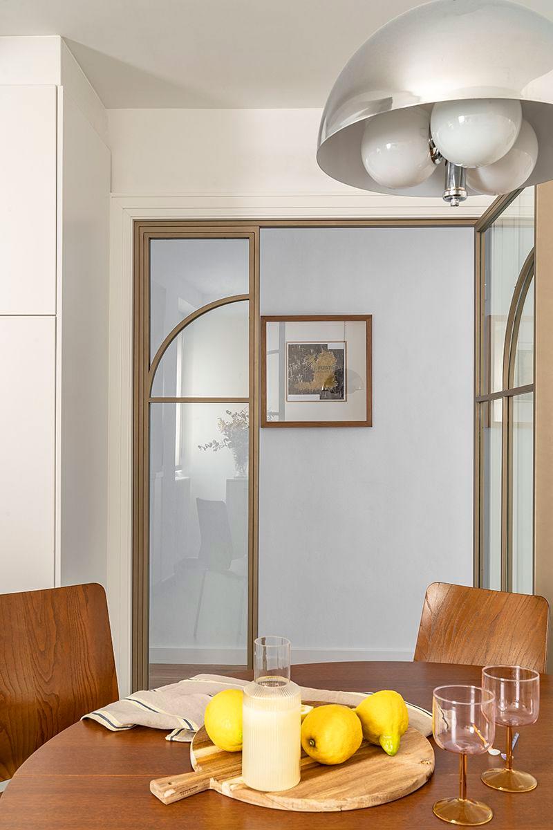 Uno de mis elementos favoritos de esta vivienda, quizás por la que hoy está en el blog, es la puerta de la cocina. Como ya os he contado en varias ocasiones, estoy algo cansada de los cerramientos en negro y cristal, éste con la perfilería metálica en color champán me parece todo un acierto (una tonalidad atemporal y de la que difícilmente te cansas). Si os fijáis está hecha con el mismo diseño que el resto de las puertas.