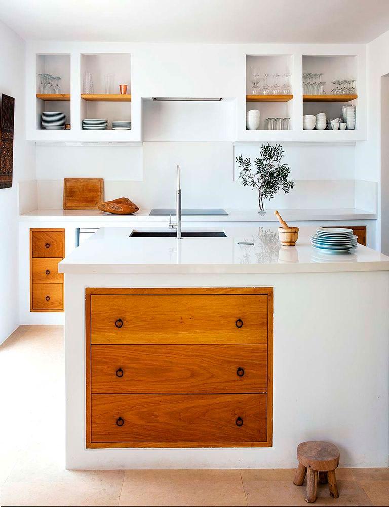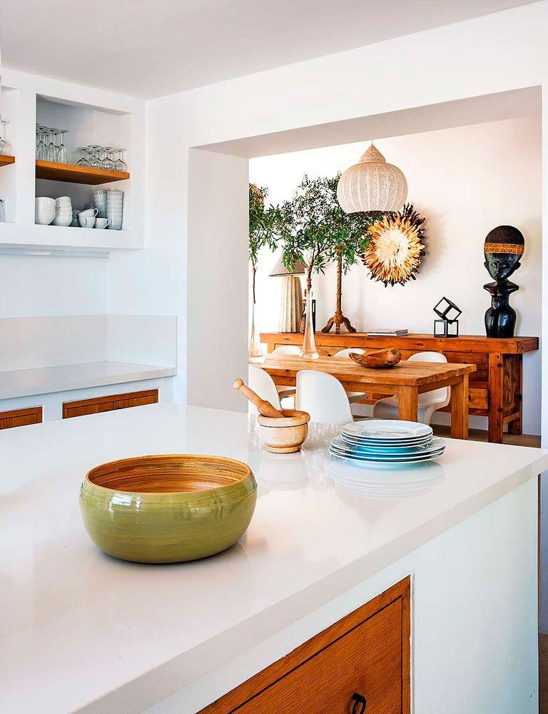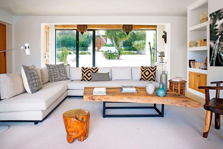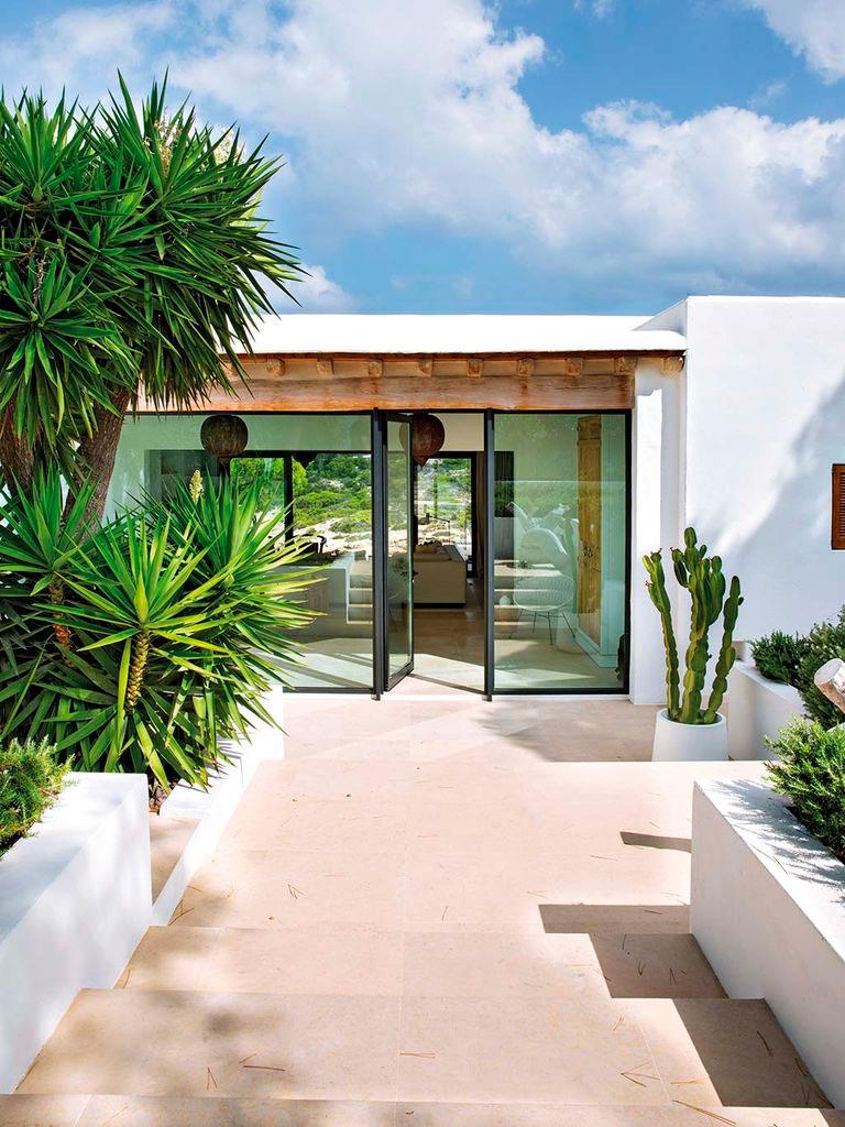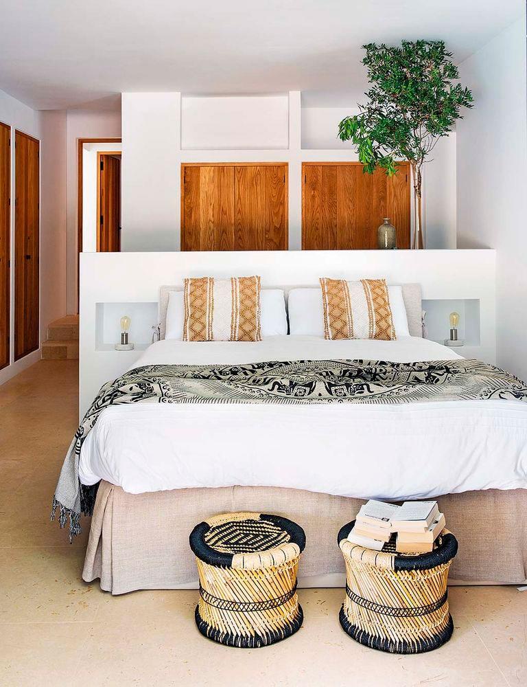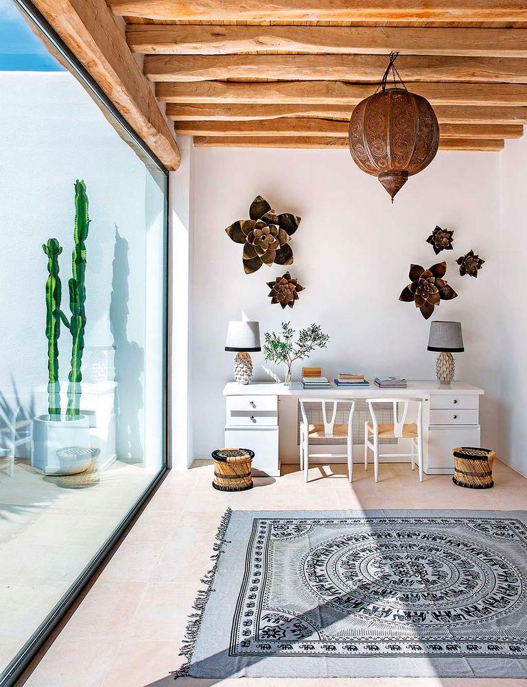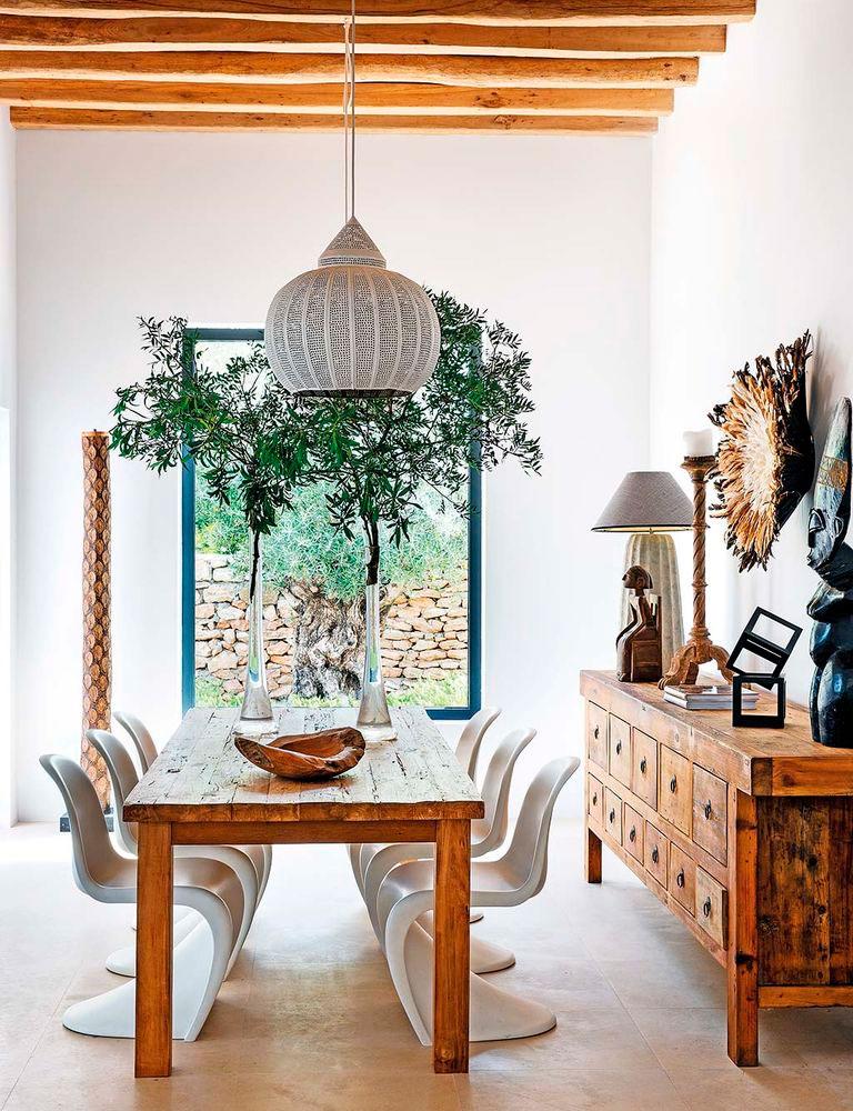 La casa es de los años cincuenta así que necesito la intervención del estudio de arquitectura Blakstad, especializado en las islas, en mantener la esencia y el espíritu de la zona balear, pero a su vez conjugando tradición, funcionalidad y estilo contemporáneo. Por ello en la casa podemos ver materiales típicos de la zona: vigas de sabina para el tejado, arcilla, arena, piedra seca,… En consonancia Raúl Martins, encargado del interiorismo, continuó acentuando el estilo Ibicenco, pero dejando que los espacios respiraran. Amplitud en los ambientes, ausencia de puertas y una gama de color muy sencilla y tranquila (blancos, beige, madera y negro). El diseñador introdujo muchos de sus diseños a medida en la vivienda, también quiso mezclar con piezas antiguas y otras de artesanos locales, porque llevar una parte de Ibiza en la decoración de la casa, la hace más auténtica.