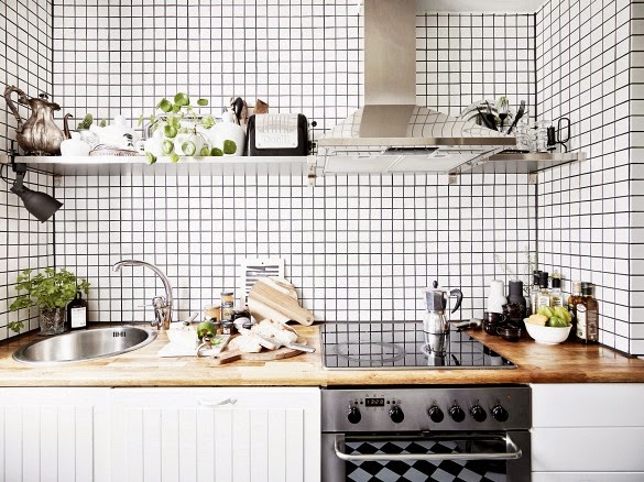 Destacando la cocina por el suelo cerámico en blanco y negro y las baldosas de la pared blancas con junta negra y el toque de la encimera de madera.