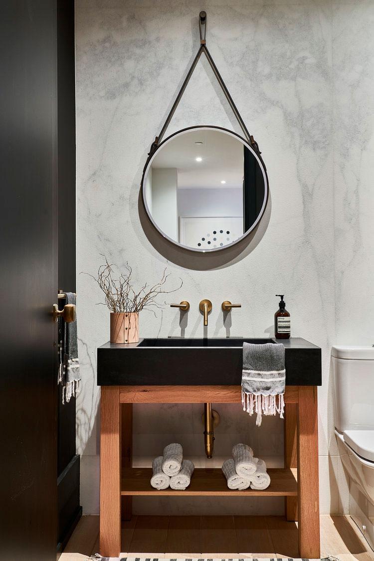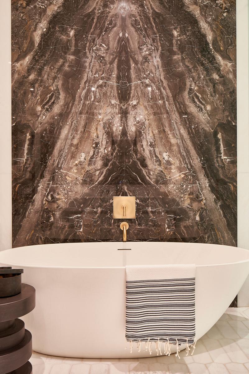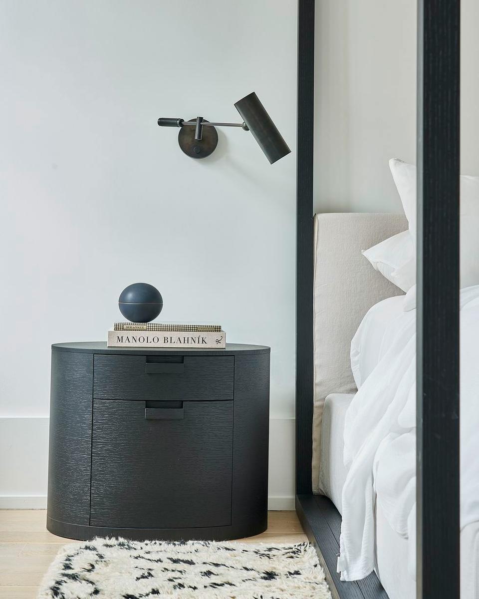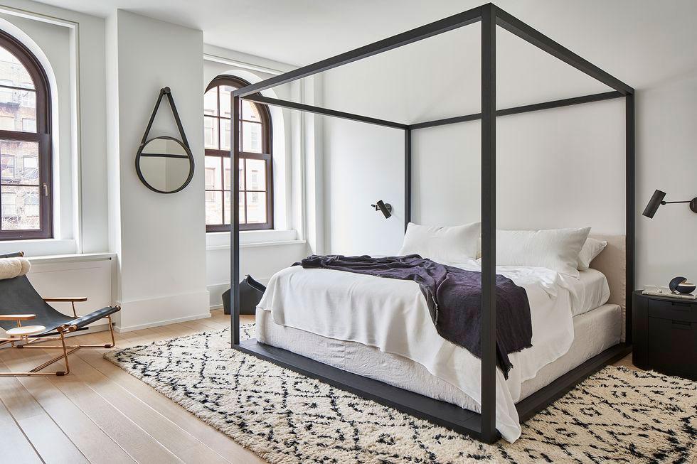 De ahí pasamos a las zonas privadas, el amplio y luminoso dormitorio principal se puede permitir una gran cama con dosel en color negro sin resultar pesada, enmarcada por una mullida alfombra bereber a tono con el resto de la habitación. Un increíble vestidor permite que todo quede en orden, y para terminar la suite encontramos el baño principal, que sigue el mismo estilo en cuanto a materiales y gama cromática.