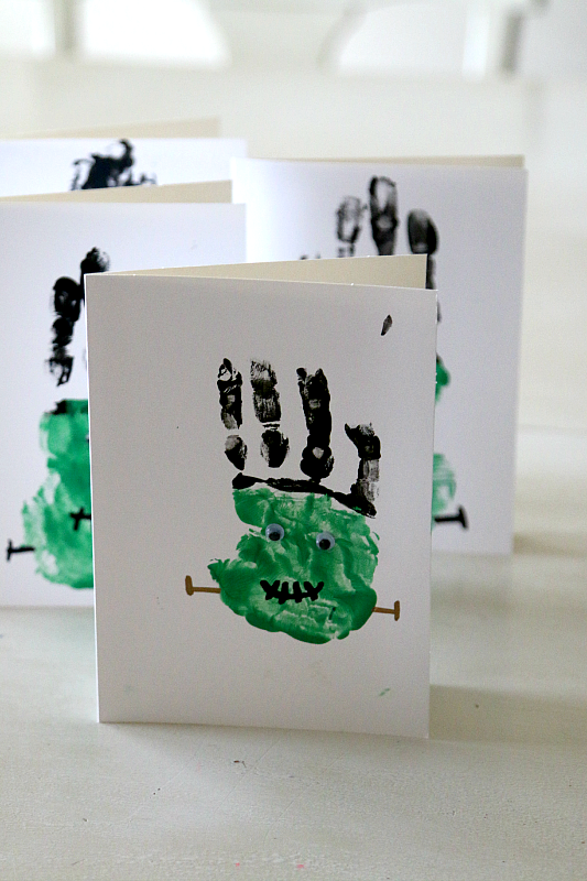 Tal y como nos enseñan en el blog Momdot, hacer esta decoración para Halloween es tan sencillo como pintar la mano de los más pequeños de dos colores, verde y negro, para estampar nuestro particular Frankenstein en las tarjetas o invitaciones.