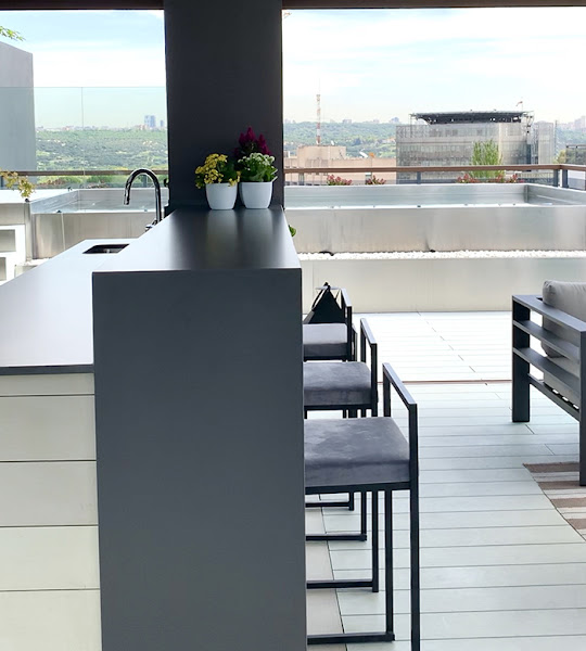 Entre las necesidades de mis clientes estaban una barra de bar con fregadero, nevera y muebles, un aseo, una fuente, riego automático, iluminación, jardinería y por supuesto un montaplatos.