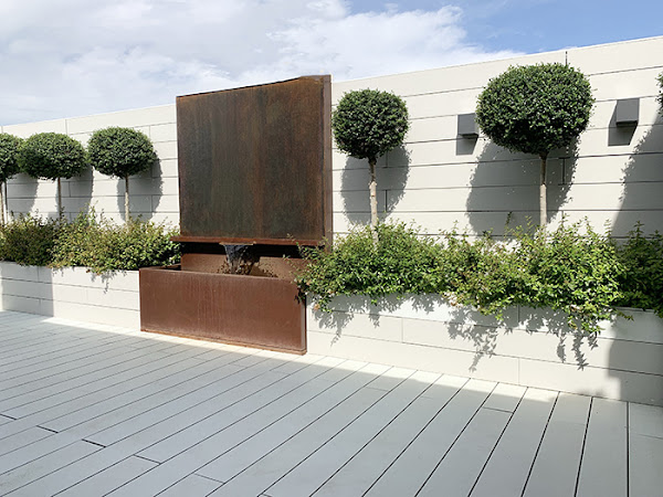 Una vez terminado, trajeron e instalaron la fuente, pusimos el mobiliario y nos encargamos de la jardinería.
