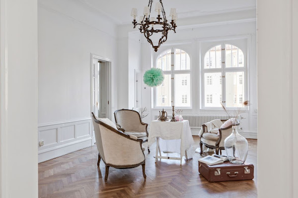Buenos días a todos!! Os queremos enseñar un piso impresionante en Suecia, con bonitos detalles como las puertas de corredera, suelos victorianos, altos techos, molduras y estuco en los techos, chimenea, estufa de azulejos ...no os lo perdáis porque merece la pena ver las fotos. Vía¡Feliz semana!