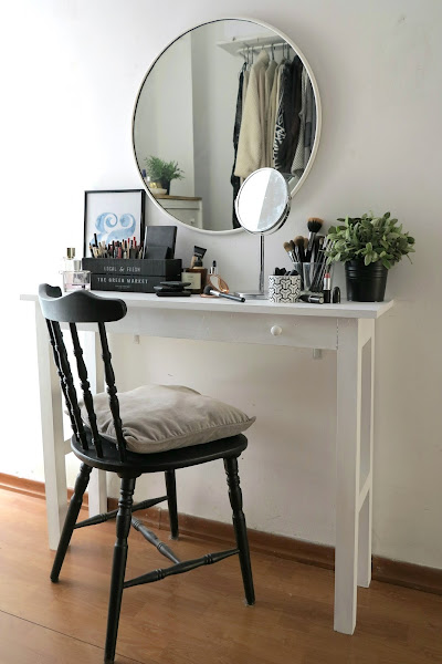 ¡Buenos días! Como ya os conté hace poquito en el post con los nuevos cambios que había hecho en mi vestidor, quería darle un cambio al pequeño tocador que tenia. Como tenía varios restos de otros proyectos por casa, me decidí a darle ese pequeño cambio. No mucho, solo convertir la balda que puse en su momento para que me hiciera la función de tocador de una forma muy baratita, en una mesa. La est ...