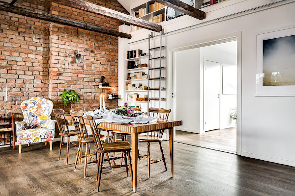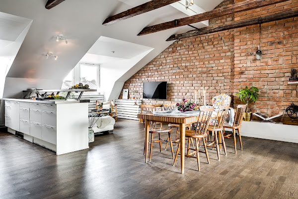 Si tuviéramos que clasificar este ático dentro de un solo estilo, está claro que tendríamos que decir que sin duda pertenece a un estilo nórdico. Pero si nos vamos fijando poco a poco en las fotografías vemos que no es solo así, si no que podemos encontrar en el una mezcla de ellos al mismo tiempo. Podemos ver elementos que son mas propios de una decoración digamos tradicional como pueden ser las paredes de ladrillo visto, las vigas o algunos detalles dentro del mobiliario. Pero también podemos ver elementos que forman parte de un estilo más contemporáneo, como las mesitas del salón o la zona del comedor. Sin duda una mezcla que consigue un buen resultado.