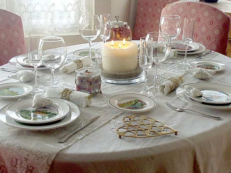 Opta por engalanar una bandeja con tus motivos favoritos. Te damos una idea: un osito de paja, unos candelabros y unos recipientes de cristal. En cuanto al menaje, dorado y plateado no pueden faltar, ya sea por medio de cubertería y cristalería o gracias a portavelas, anillos para servilletas, etc. Sobre un camino de mesa que recuerda a los adornos con relleno del árbol con motivos blancos, descansa una vajilla de Villeroy & Boch de temática rural.