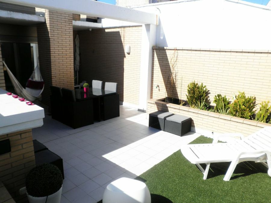 Por último, en la planta de arriba encontramos un pequeño despacho con una zona chill out, de nuevo la apertura del espacio hacen que parezca mucho más grande visualmente. La terraza del ático es una de las estancias estrella de la casa. Se ha jugado con los materiales para diferenciar a la perfección la zona de relax (tumbona, césped artificial) con la zona dedicada al comedor.
