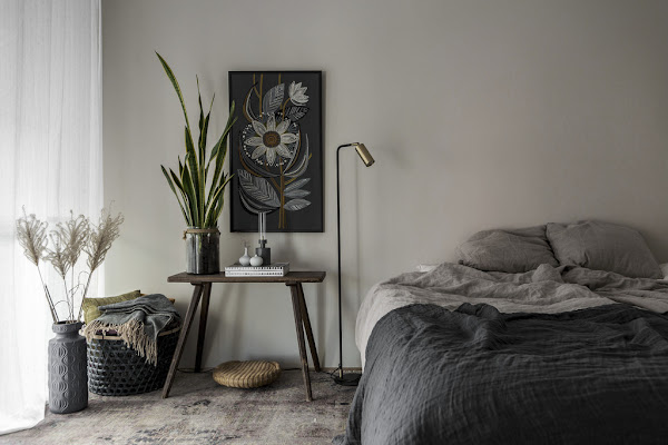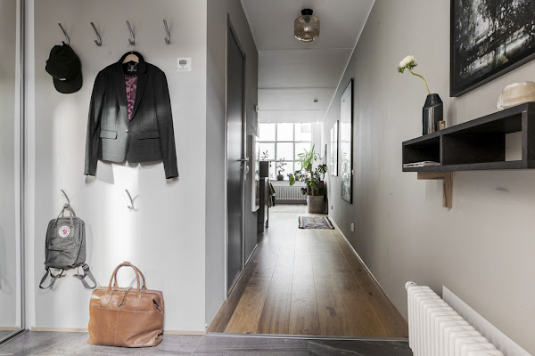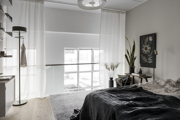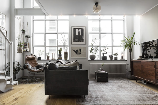 Me gusta mucho de este loft sobre todo la sensación tan acogedora que transmite su decoración. Esto creo que es un factor importantísimo en un hogar porque si nuestra decoración es fría y no transmite esto que os comento, creo que esa decoración no cumple su objetivo que no es otro que hacer que nos sintamos a gusto y cómodos en nuestra casa. Pienso que en este caso, los "culpables" en este caso de crear esa sensación tan buena que os mencionaba, son el color gris, la madera, los textiles y las plantas.