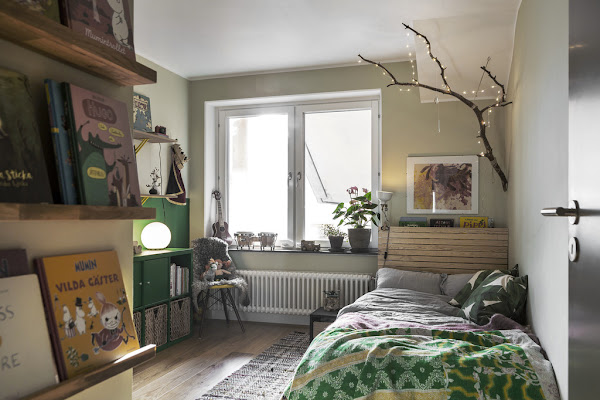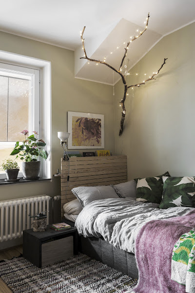 Por otro lado me han gustado varios detalles de la decoración, los cuales creo que podríamos copiar perfectamente para nuestras casas. El primero de ellos sin duda me ha encantado y me parece una solución genial. Se trata de como juntado la mesa de comedor con la isla de la cocina. Elevando un poco el murete de esta, se consigue separar ambos ambientes de una forma visual pero sin hacerlo realmente. Fantástico . También me ha gustado la estupenda zona de lectura que esta a los pies de la escalera. Un rinconcito ideal que aprovecha perfectamente el espacio. Y lo ultimo que me gustaría destacar es el dormitorio infantil, concretamente su bonito cabecero y esa rama de árbol adorna con luces, que invita tanto a soñar. Una idea muy fácil de hacer.