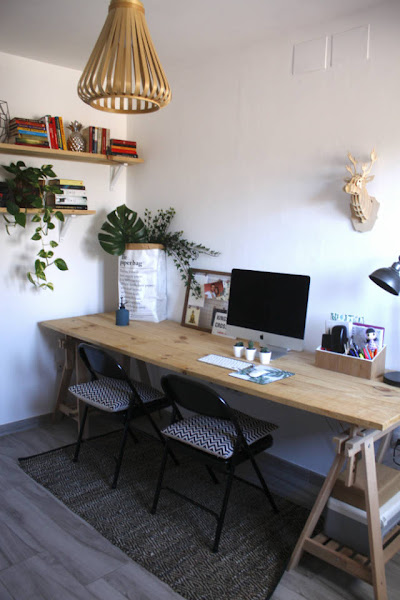 En cuanto a mobiliario que hayamos hecho nosotros, por ejemplo en el despacho, el escritorio de madera, tanto el tablero como las estanterías que están colgadas de la pared la hicimos nosotros con ayuda de mi padre (que es un manitas), compramos la madera en una ferretería y nos pusimos manos a la obra, en mi canal de Youtube subí un vídeo mostrando todo el proceso.