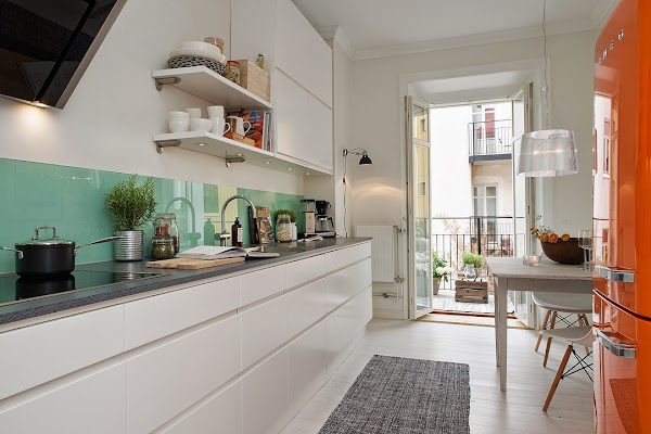 Bueno volviendo al apartamento, me llama mucho la atención la elección de formas geométricas para la decoración. Los textiles del salón y el papel pintado de la entrada son lo elementos elegidos para resaltar esas estancias con su líneas, triángulos y cruces. Por otro lado esta la cocina, donde es inevitable fijarse en la nevera. Que bien destaca ese naranja sobre el resto. De la cocina me gusta mucho su sencillez en cuanto a elementos se refiere y como se ha aprovechado hasta la perfección todo el espacio.