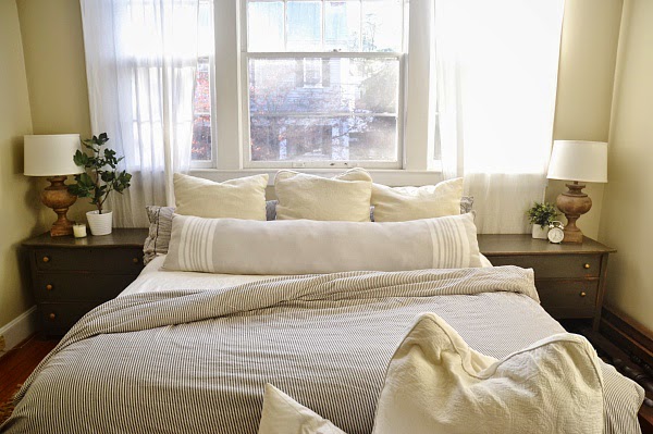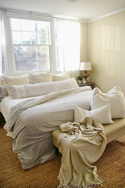 Porque es de las estancias que más apreciamos, y siempre la debemos tener acorde con nuestro estilo. En el dormitorio de hoy os muestro el lado más natural y sencillo, las mesitas de noche son antiguas cómodas pintadas con cajones prácticas para el almacenaje. Lamparás de mesita grandes y con presencia de color natural. Abundancia en el textil, como cojines y mantas recorren toda la habitación y es que consigue muchisima calidez a la hora de decorar cualquier estancia. En el caso de la funda nórdica siempre suelen acertar ese tipo de estampado como son las rayas pequeñitas, que dan el toque natural que se busca. Cestas para ayudar al almacenaje y una gran alfombra de material natural consigue que la decoración sea perfecta.
