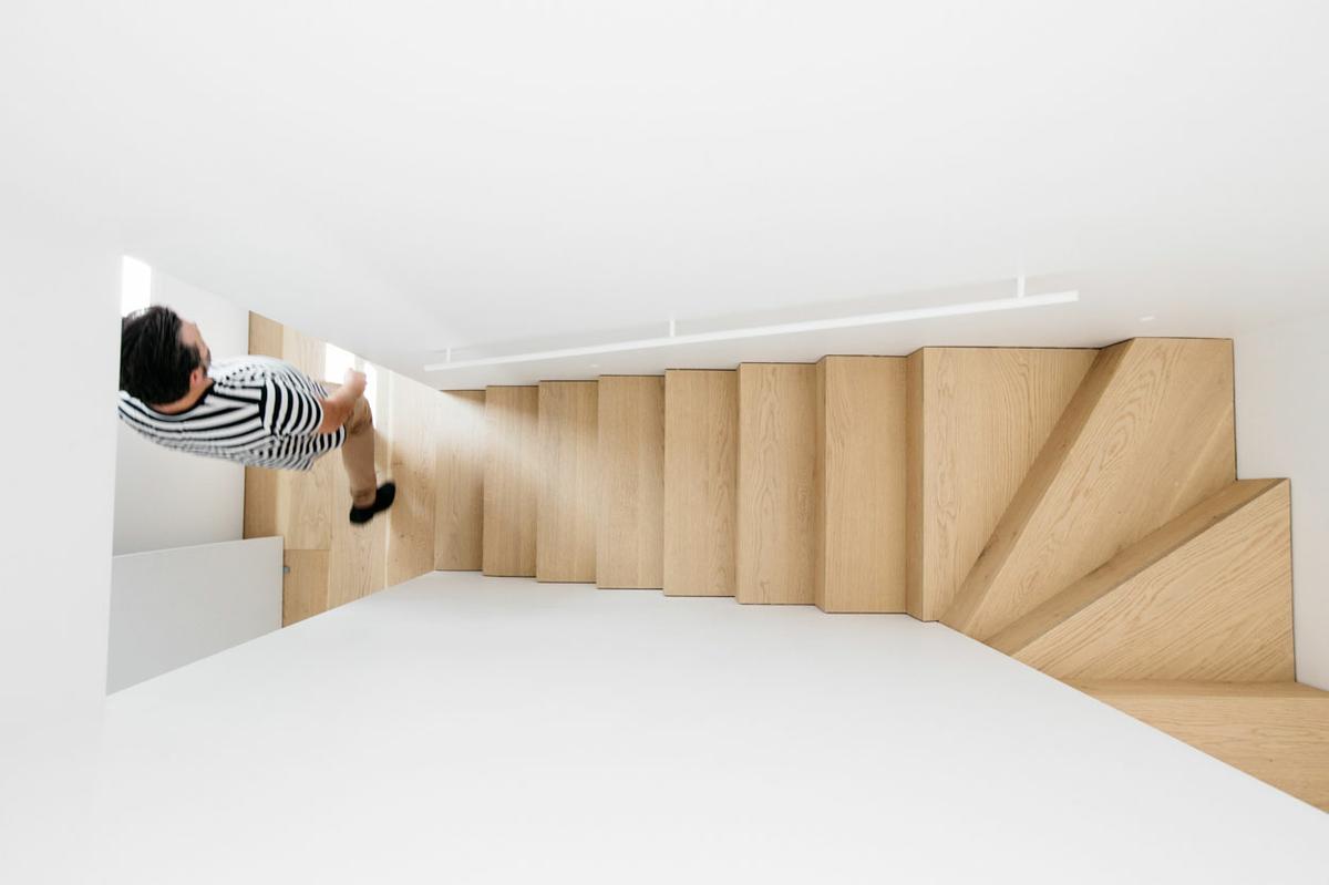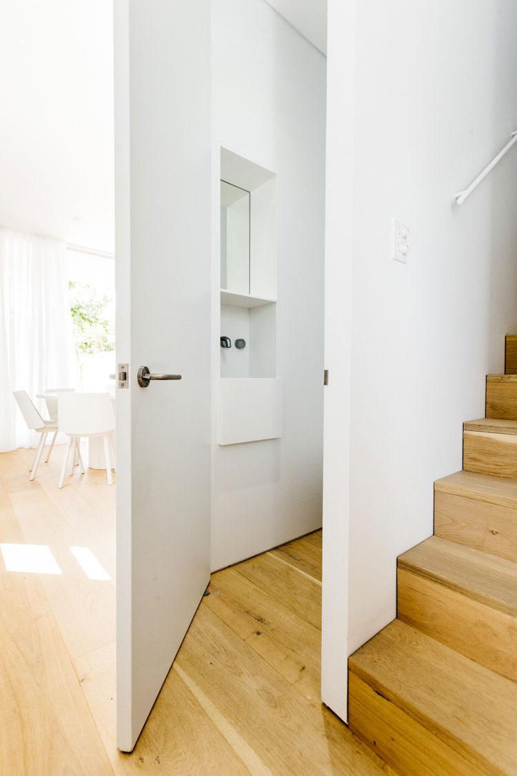 El encanto de esta vivienda, proyecto de cm studio, se percibe ya desde fuera, dentro es de lo más mínimal que ha pasado por el blog. El blanco lo invade todo y sólo toques en madera le otorgan calidez. Desde el techo de la entrada, a las preciosas y sencillas escaleras, el suelo, la cama, las tablas de cortar de la cocina, el taburete del baño y poco más. También encontramos pinceladas en pequeños objetos siguiendo la misma gama cromática, como un cojín de cuero en el salón o una obra de arte color mostaza en el comedor. A esto lo llamo yo un lienzo en blanco, una casa a la que podrías cambiar la decoración con sólo meterle algunos textiles en color y parecería otra completamente distinta.