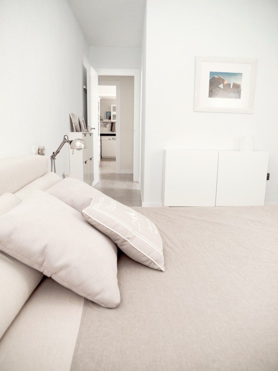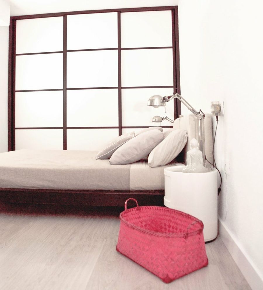 El dormitorio quizá sea la estancia más minimalista de toda la casa. Colores blancos, neutros, ausencia de decoración en las paredes... Para las mesillas se ha optado por el modelo Cosmobili y unos flexos de metal que modernizan el conjunto.No podemos pasar por alto el detalle del armario que da un aire japonés a la habitación que nos encanta.