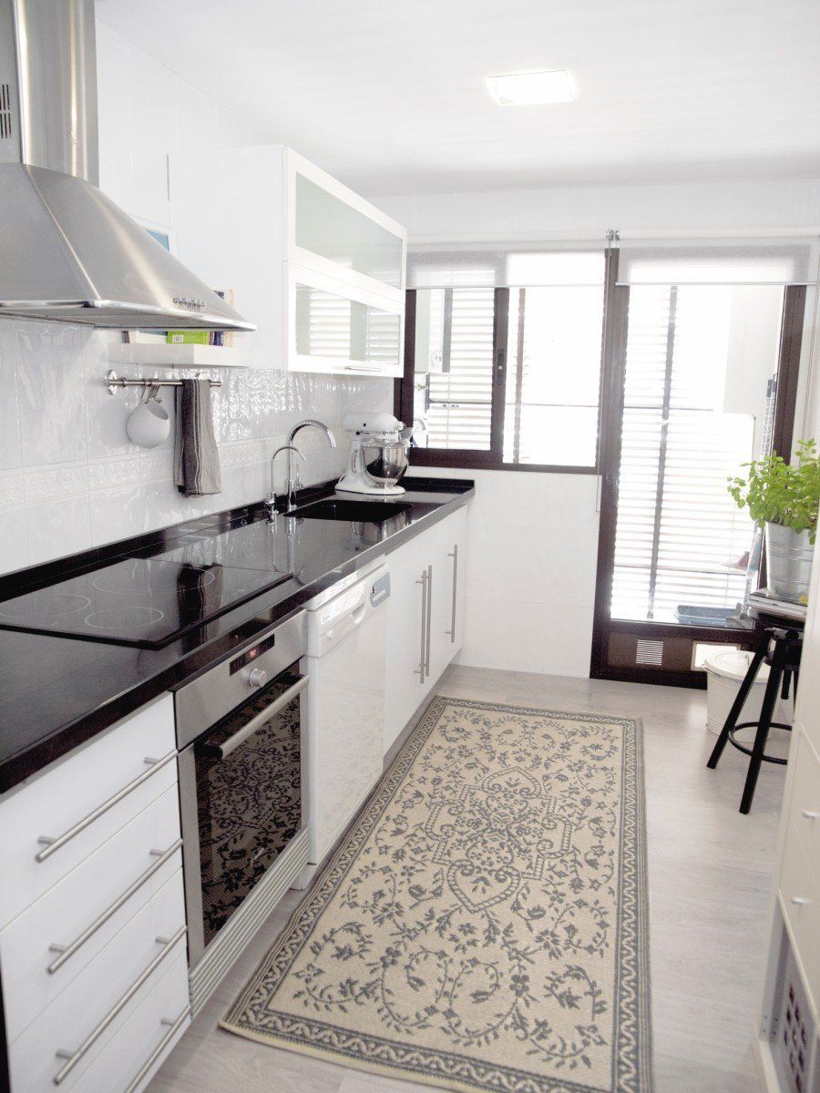 En el diseño de la cocina se opta por el binomio blanco y negro que da un aspecto de limpieza a todo el conjunto. Ella misma confirma que la reforma de esta zona fue muy económica con muebles de IKEA y aprovechando la estructura del anterior mobiliario. Nos encanta el detalle de la alfombra, sin lugar a dudas, una puesta arriesgada pero que nos encanta.