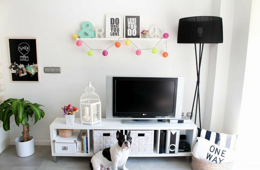 El dormitorio es una de las estancias más sencillas de la vivienda. Ausencia de cabecero, textiles en tonos claros, mesilla en blanco y un vinilo lleno de color en la pared como contrapunto. Inesitta nos comenta que ahora se está planteando comprar un cabecero para dar un aire distinto a la estancia.Atención al vestidor, porque suele ser una de las zonas que más dudas genera. En este caso se ha seguido por la línea del blanco, puesto que es un espacio pequeño y se ha decorado (sofá, estantería en escalera, caja, guinalda, etc) para no crear un espacio impersonal o donde sólo hubiera ropa y zapatos.