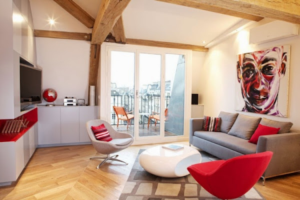 Este loft es sin lugar a dudas un clarísimo ejemplo de la técnica del 60-30-10 . Vemos como el 60 en este loft seria el color blanco, que aportaría una base de luminosidad y sensación de amplitud. El 30 seria claramente el negro (junto con el suelo oscuro de madera), que le aportarían un toque acogedor y elegante. Y por ultimo el 10 serian el turquesa y el amarillo, escogidos para crear un contraste que llame la atención de la gente y que otorgue personalidad a la decoración. Con esta técnica conseguimos crear el equilibrio perfecto entre colores como podéis ver en las fotografías.