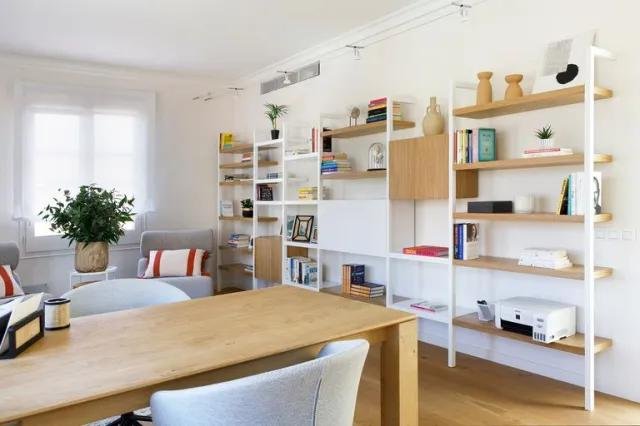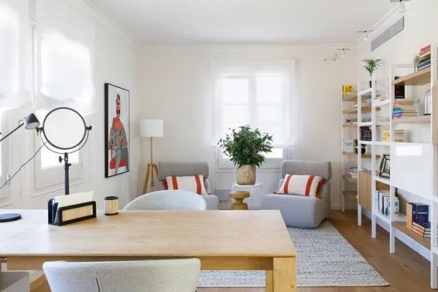 Y por último, en la tercera planta, encontramos el despacho. Se ha dividido en dos partes, un espacio para leer con dos butacas y la pared vestida con estanterías y por el otro lado, un escritorio con hasta 4 puestos de trabajo. La habitación cuenta con mucha luz natural por lo que es perfecta para trabajar.