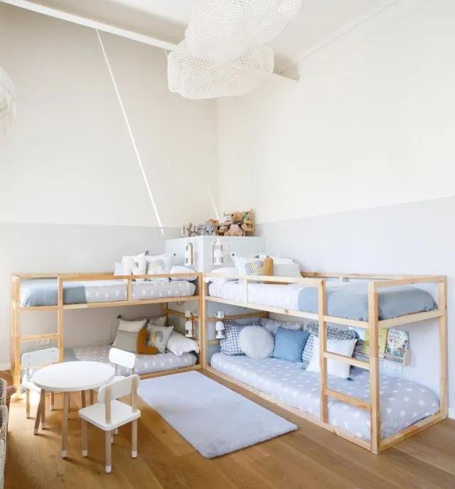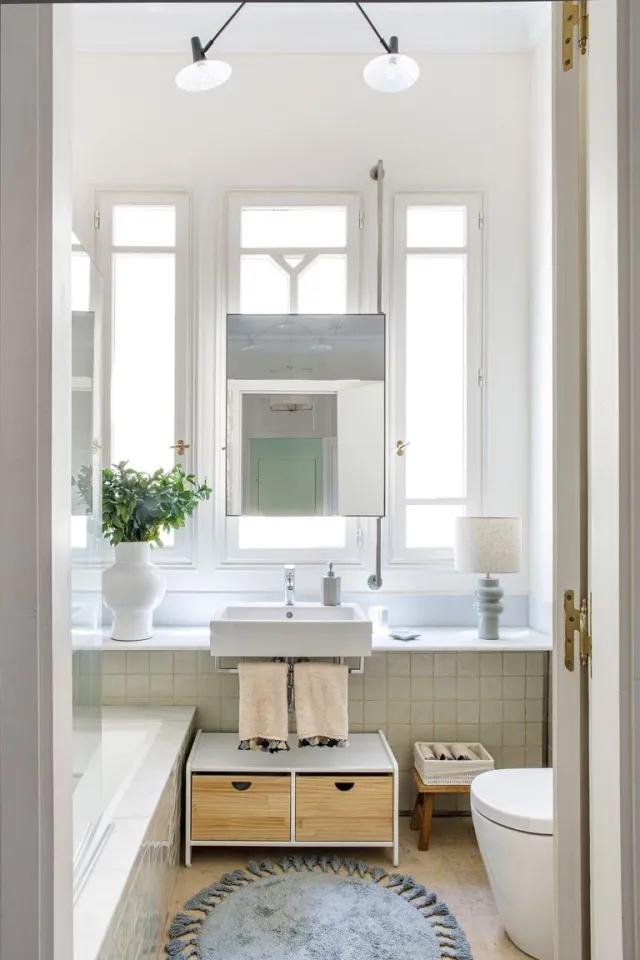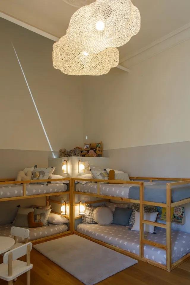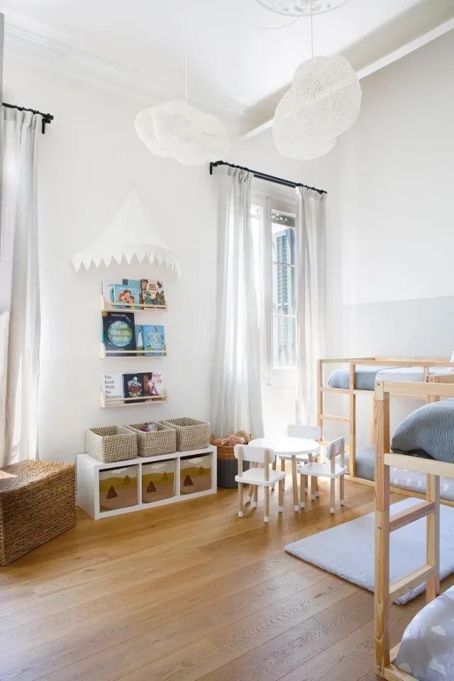 Me encanta el dormitorio infantil, es una mezcla muy acertada entre la arquitectura señorial del edificio y la estética contemporánea siguiendo el método Montessori con las literas a ras del suelo. Las lámparas simulan dos grandes nubes que cuelgan de un techo maravillosamente alto y quedan por encima de las literas, entre ambas y donde se apoyan, se diseñó un mueble a medida con capacidad de almacenaje y espacio para colocar cuatro pequeñas luces individuales. El baño infantil, es sencillo y pensado para ser utilizado por varios niños con compartimentos para guardar sus enseres de higiene.