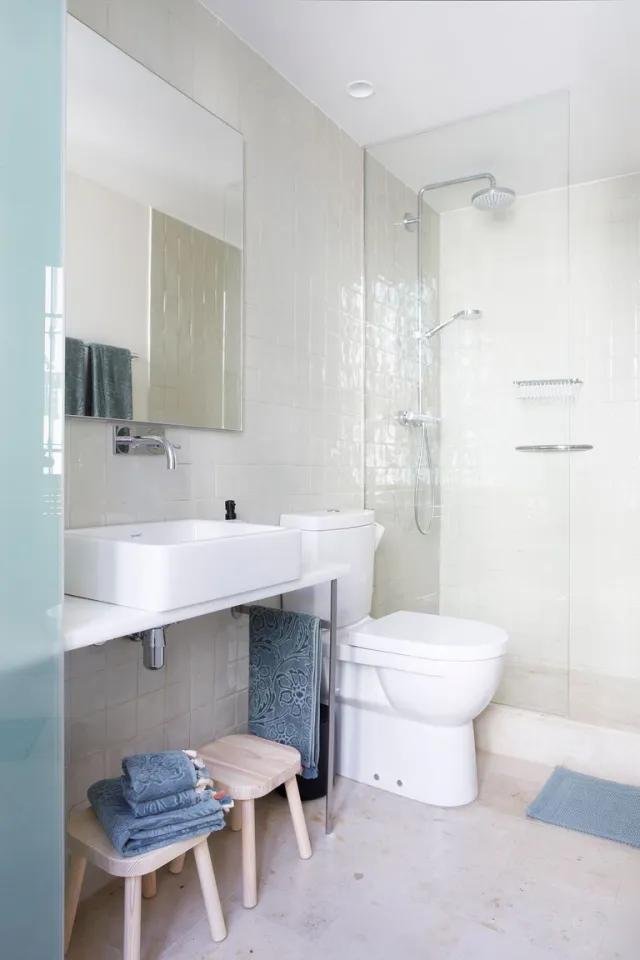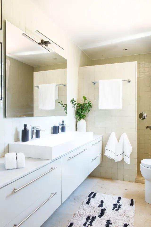 El baño principal es sencillo, sin más pretensiones, con los mismos tonos del dormitorio. Predomina el blanco y se han colocado algunos accesorios en negro.