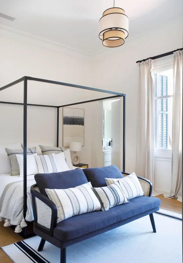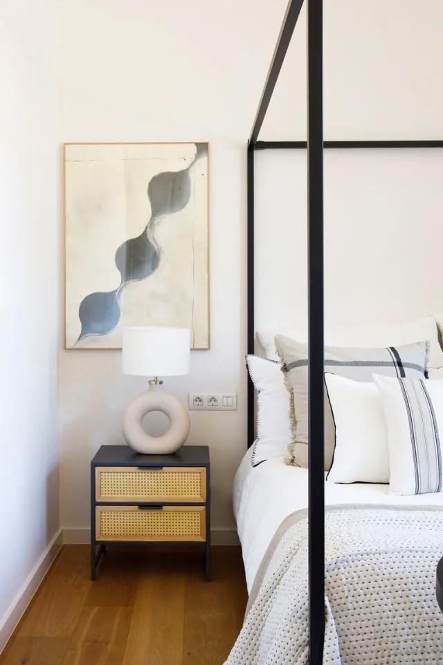 Subiendo a la primera planta, encontramos los dormitorios. Lo primero que encontramos es la habitación principal con baño en suite, vestidor y salida a una terraza. Gracias a la altura de los techos se han podido permitir meter una cama de estructura metálica con dosel, punto focal indiscutible de la habitación. Gracias a su amplitud también, a los pies de la misma, se ha colocado un sofá tapizado y con los laterales de cannage (material que se repite en el piso de abajo), también en las mesillas de noche y en la lámpara del dormitorio.