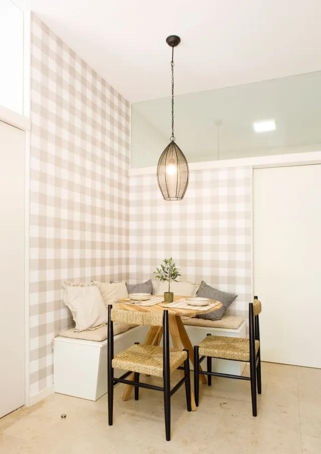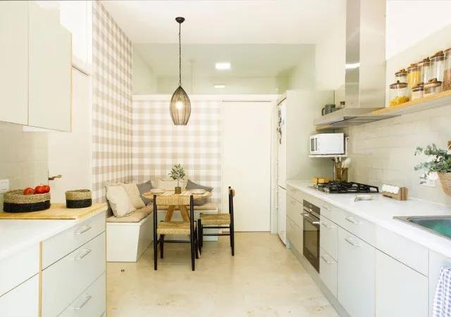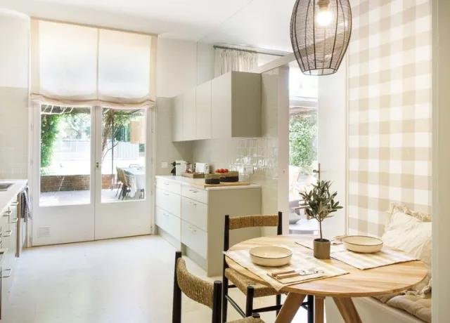 Dentro, desde el comedor, accedemos a la cocina. Aunque el mobiliario parezca blanco no lo es, es un tono verde muy pálido que combina perfectamente con el papel elegido para el office de cuadros vichí en color tostado y los estores en el mismo tono. El encanto de la cocina lo tiene el pequeño office, de nuevo se sustituyen las sillas de un lado por un banco con tapa abatible que permite almacenar cosas y se combinan con otras dos sillas dándole dinamismo. La mesa redonda es todo un acierto, ocupa menos espacio y siempre es más agradable para comunicarse entre comensales.
