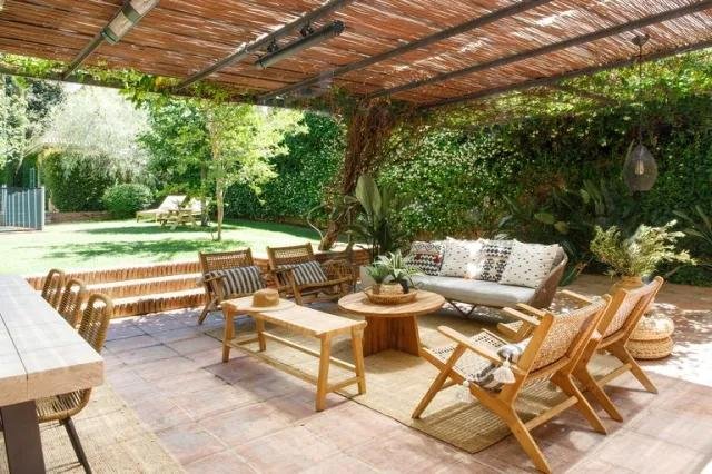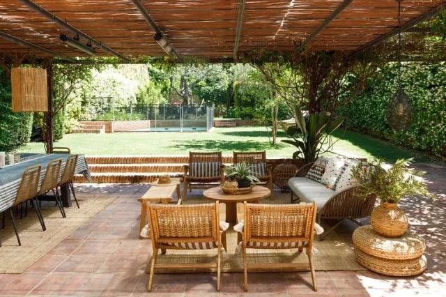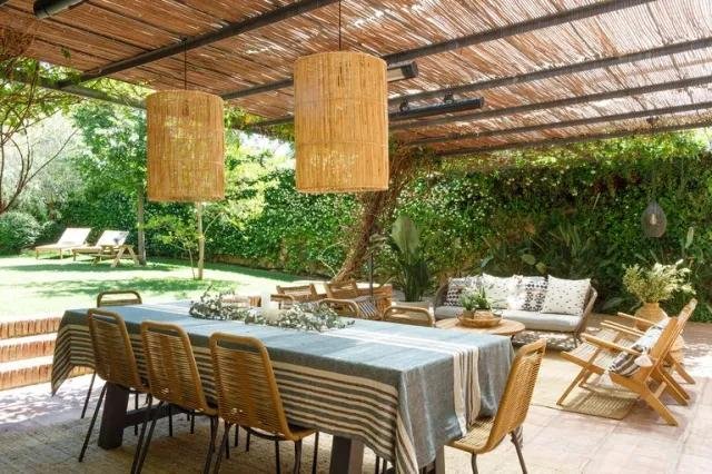 Un chalet en el campo no sería tal sin un buen jardín con zona de comedor y de estar para los días de buen tiempo. En él, bajo el porche, se ha recurrido a las fibras naturales y la madera, que entre la vegetación y junto a los textiles, es un lugar que invita a pasar muchas horas.