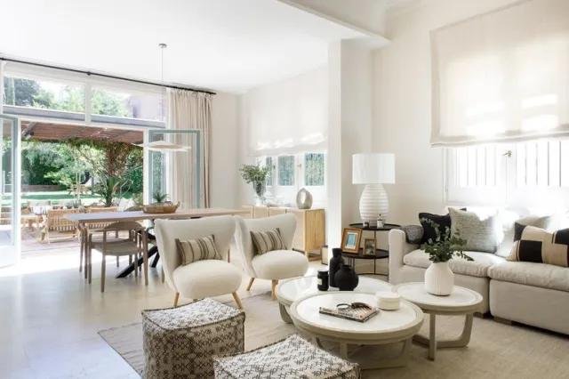 Como os decía, al otro lado de la cristalera de entrada, está el gran salón con acceso al jardín. También tiene dos ambientes claramente diferenciados, no sólo el mobiliario delimita visualmente el salón del comedor, sino que también las características arquitectónicas como las diferentes alturas del techo, zonifican las distintas estancias, siendo el techo del salón más alto que el del comedor, donde se le ha dado protagonismo con un rosetón.