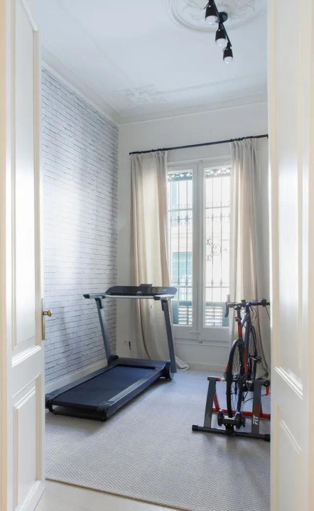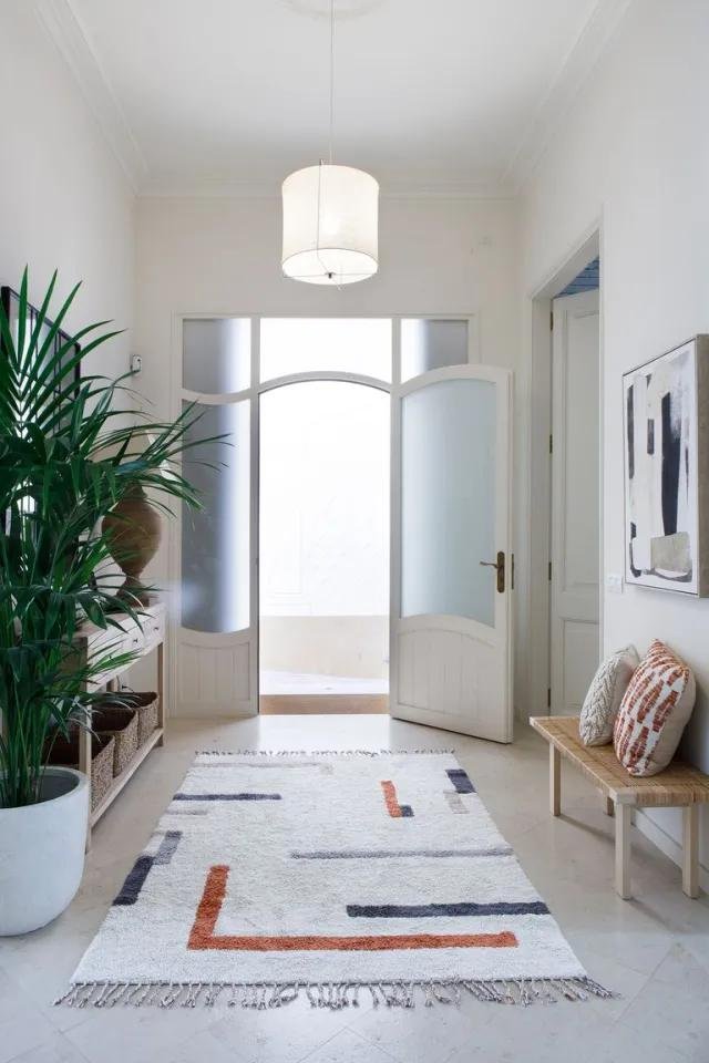 De la entrada ya me ha enamorado la puerta acristalada que lo inunda todo de luz y la sencillez con la que se ha decorado la estancia. Un banco de fibras, una consola y una alfombra, sirven para llenar este espacio. Espacio que divide la casa en dos alas, a la izquierda dos habitaciones, la más pequeña dedicada a gimnasio (con la pared empapelada en ladrillo visto) y la otra, a sala de televisión con un baño anexo. A la derecha, encontramos la cocina, el salón-comedor con acceso al jardín y una casita de invitados.