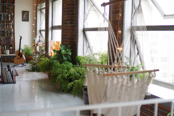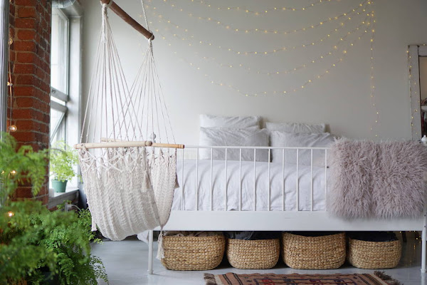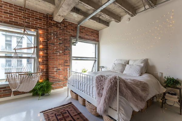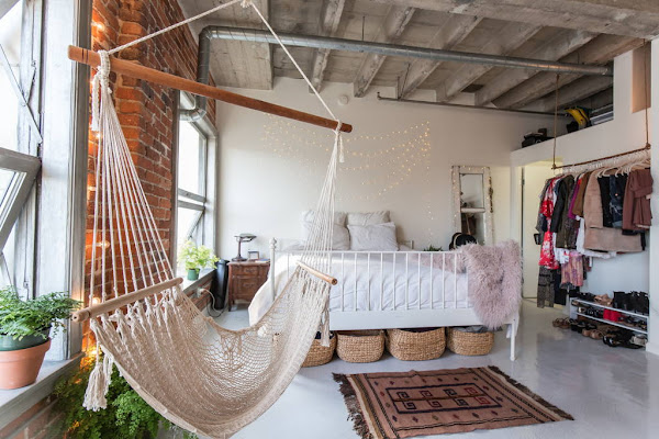 Este loft tiene varios detalles que me han gustado un motón, y uno de ellos es la hamaca que esta cerca de la cama. Me parece un lugar ideal y una idea genial para perderse varias horas organizando pensamientos o leyendo un buen libro. Otro detalle bastante molón es como han colocado una guirnalda de luces en lo que seria la pared del cabecero de la cama dándole un toque muy acogedor a ese espacio. También me gusta mucho como se han colocado el resto de guirnaldas para iluminar el resto del espacio. Ya sabéis que siempre que veo una guirnalda lo primero que se me viene a la cabeza es la idea de fiesta o verbena y en este caso me pasa igual, no lo puedo evitar y es una cosa que me encanta jaja.