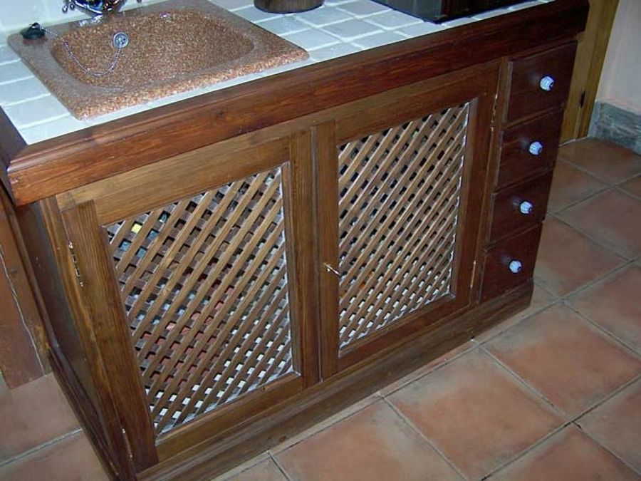 La integración de los elementos culinarios ha tenido lugar gracias a un mueble de pino proyectado por Ricardo y su equipo dividido en dos partes diferenciadas: un mueble superior de dos puertas y uno inferior con cajones, además de dos puertas con celosía protegida del polvo gracias a unas láminas de metacrilato.