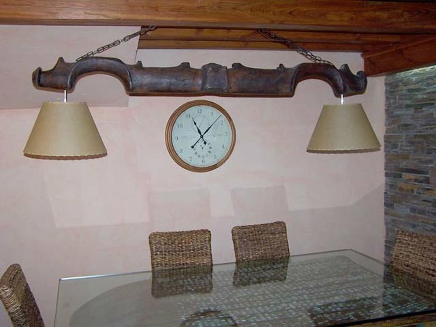De los extremos de un vetusto yugo cuelgan dos lámparas, contribuyendo al estilo ornamental de aire rural. La iluminación indirecta de este ambiente vitícola se consigue con la instalación de cuatro tubos fluorescentes entre la viga horizontal y la pared.