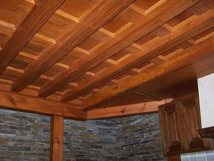El techo es una verdadera obra de arte. El delicado artesonado aporta al conjunto un matiz mudéjar muy importante, ya que esta forma tan peculiar de adornar las techumbres se extendió en España gracias a los musulmanes españoles que permanecieron en el país tras la Reconquista.El espacio en el que se ha llevado a cabo la transformación tiene una superficie de 6,5 m. de largo por 3,5 m. de ancho. La madera es el material protagonista de esta exquisita reforma, empleándose las variedades de pino viejo y norte, en una tonalidad pino-teca.