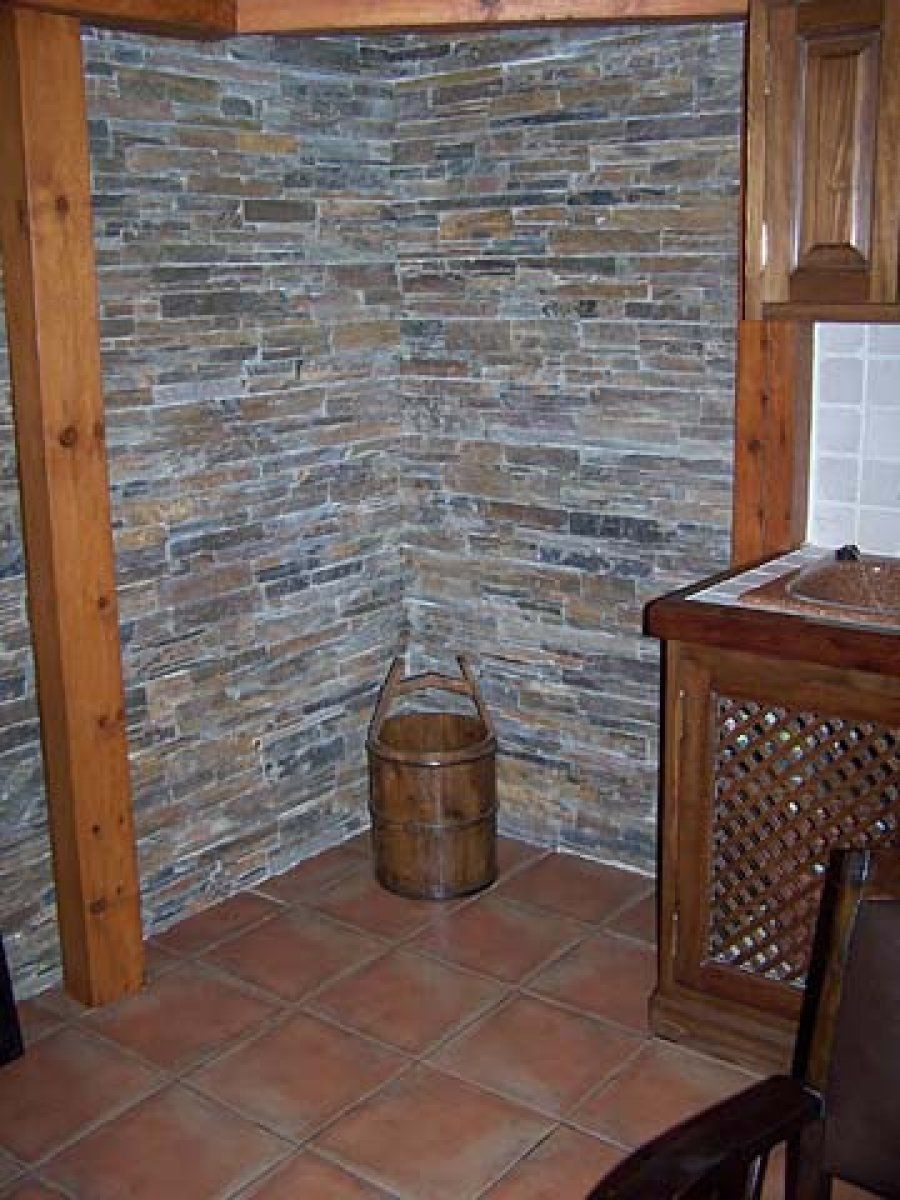 En absoluta armonía con la madera, convive la laja, un tipo de piedra lisa, plana y grande que se ha utilizado para construir la pared. La evidente influencia rústica de este particular revestimiento concede a la bodega un toque natural ciertamente atractivo.