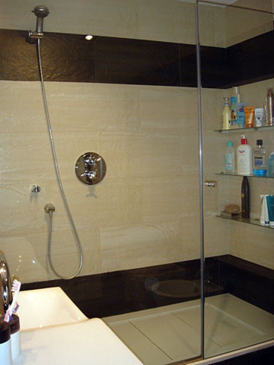 El otro baño sigue la línea del anterior, deleitándonos con sanitarios de formas sugerentes. La ducha de pared se apoya en un panel de vidrio transparente, mientras que el suelo de silestone blanco está formado por listones separados por tres milímetros entre sí, conduciendo el agua a un sumidero artísticamente disimulado.