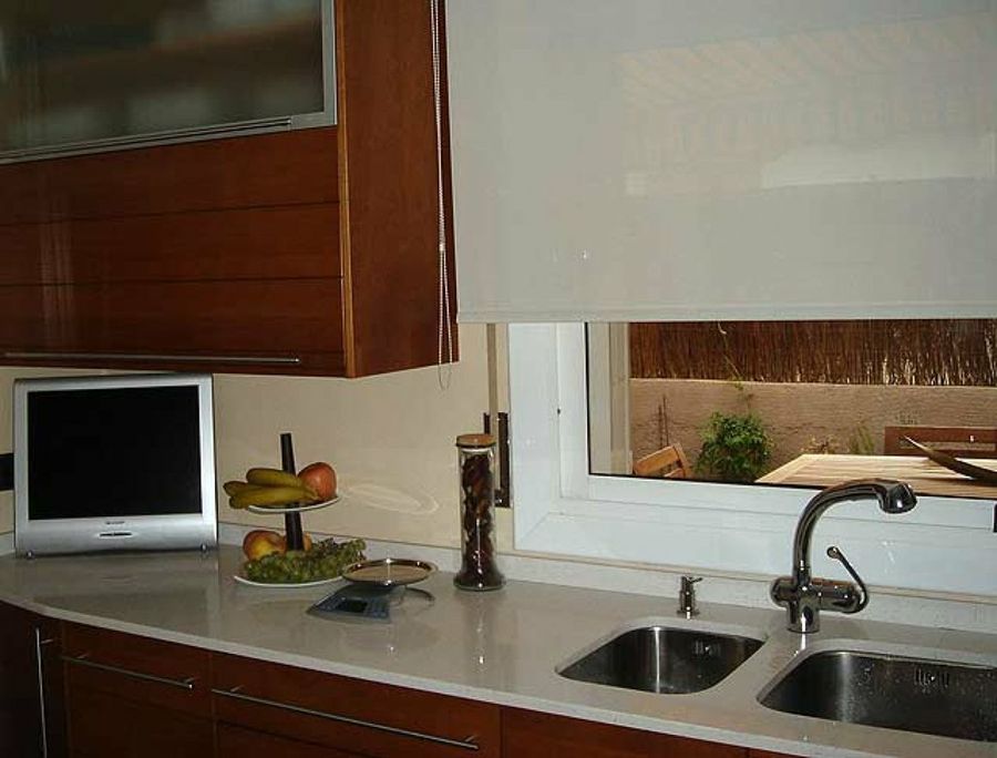 La cocina es un auténtico homenaje al buen gusto y a la estética más refinada. El cerezo de los muebles y vitrinas inunda el espacio de elegancia, mientras que la encimera de silestone blanco ofrece un contraste muy estudiado. Electrodomésticos en inox ponen el broche de oro al rincón del paladar.