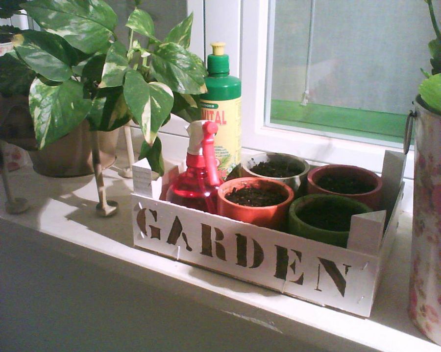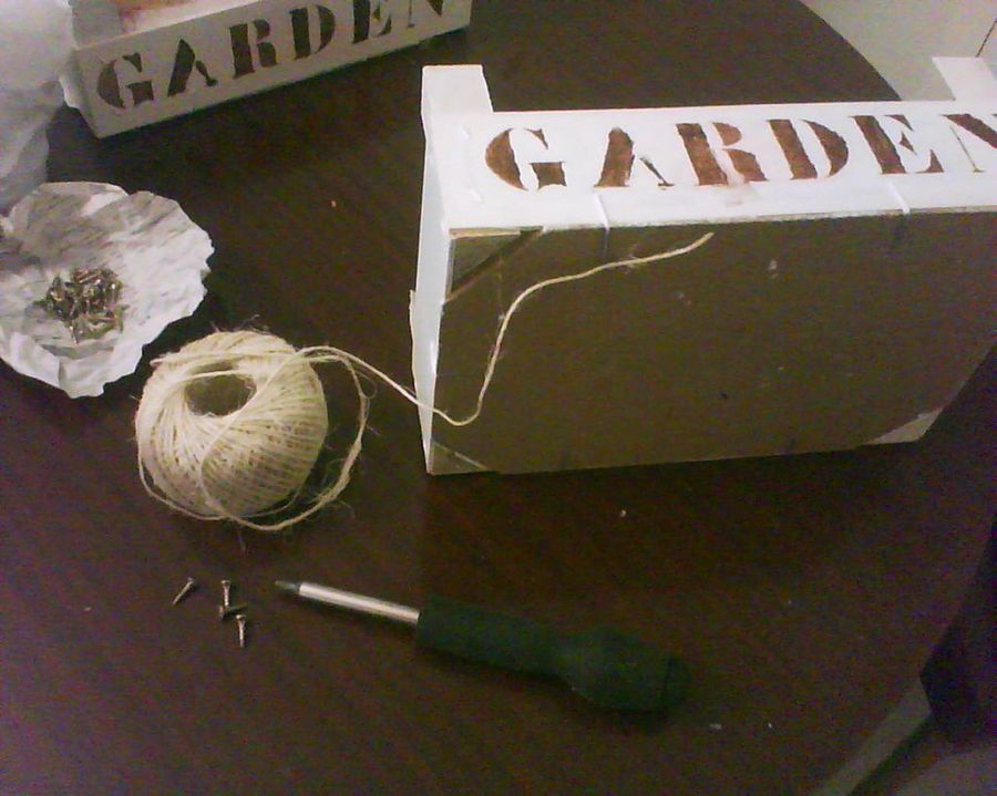 El siguiente paso es hacerle unas asas para poder colgarla sin problemas. Para esto necesitamos poner un tornillo en cada esquina de la caja y trenzar una cuerda. De este modo podremos colgar el semillero en la terraza o desplazarlo cómodamente por el jardín. Este paso es mejor que lo hagamos nosotros, aunque la cuerda sí puede ser trenzada por los niños.