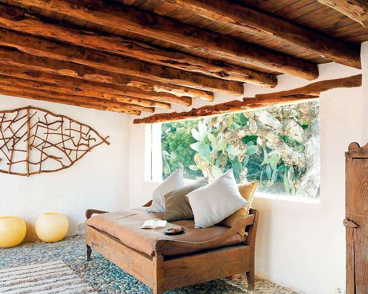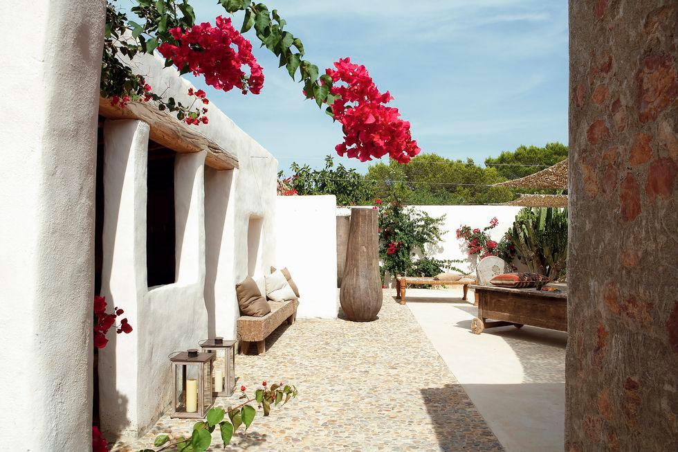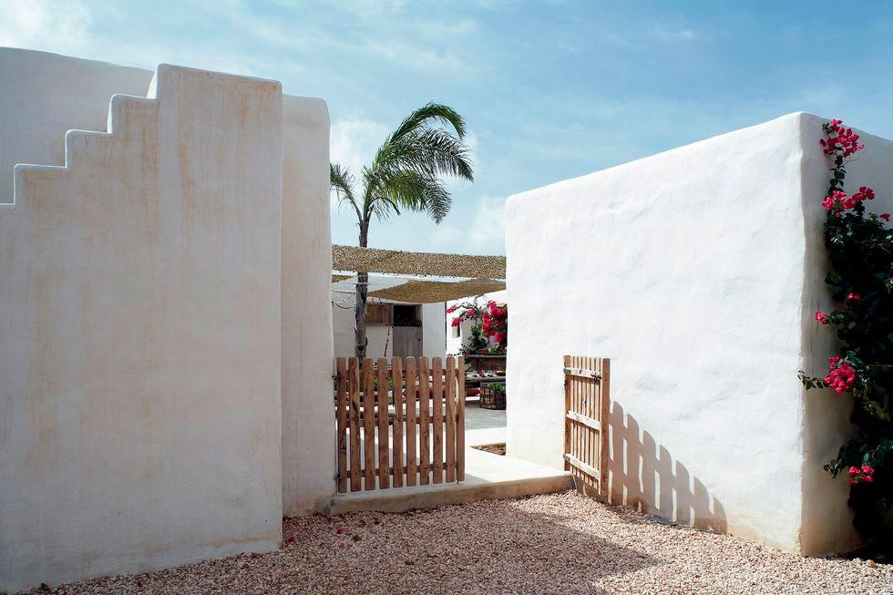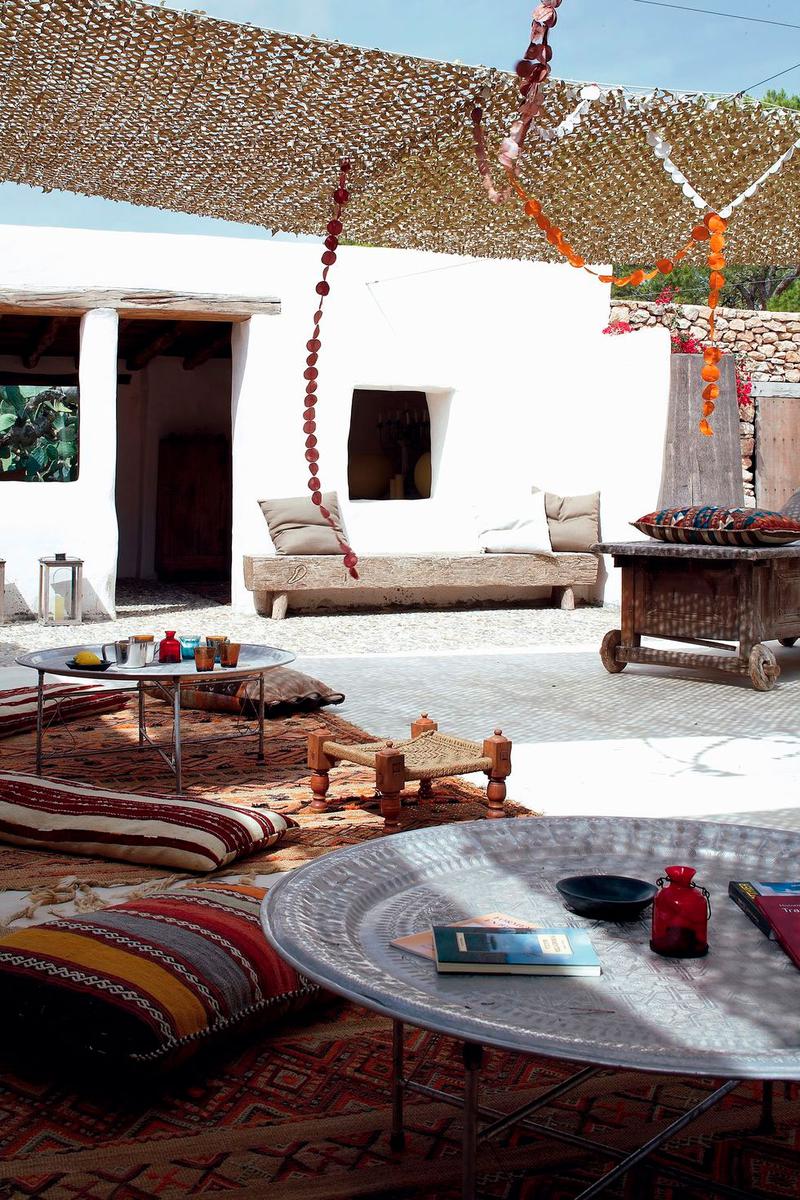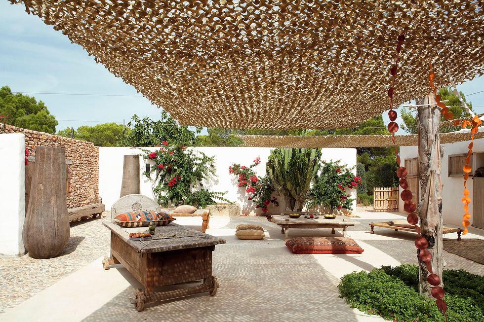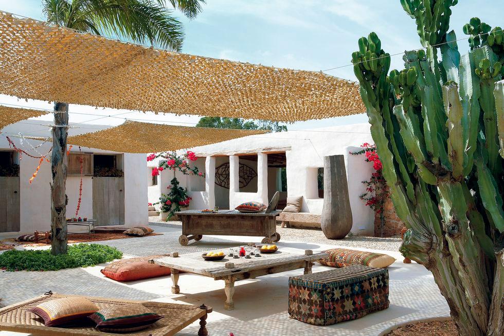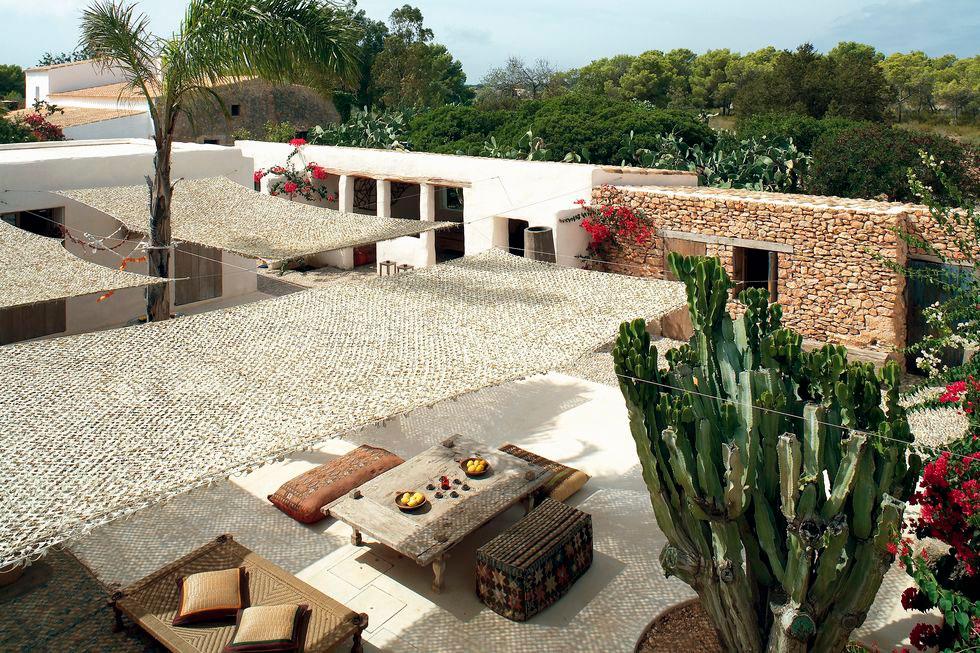 Los arquitectos Nacho Alonso y Bill Wright se encargaron de la rehabilitación de la vivienda y acondicionamiento de los anexos independientes (antiguas cabrerizas) como cuartos para sus hijos e invitados. Convirtieron además, el patio central en un espacio común al aire libre donde disfrutar y compartir momentos en familia. En dicho patio se puede contemplar los gustos de la familia por lo exótico, lo rústico, lo eco y la sostenibilidad. Encontramos a modo de toldos para hacer sombra, tejido de malla empleado por los militares para camuflarse en el desierto del Sahara. Por otro lado, mobiliario exótico tanto de Indonesia, como de Bali o Sumatra, las mesas y alfombras son marroquíes,… un mix de culturas que conviven con la forma de construir típicamente de la isla, tal como los encalados de las paredes, los suelos cemento, vigas vistas o cantos rodados. Estos materiales se repiten en el interior potenciando el deseo de los propietarios de mantener el espíritu de la arquitectura local.