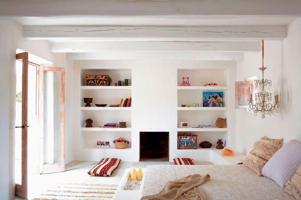 Muchos de los muebles al ser de obra, ofrecen grandes soluciones. Como en el dormitorio, a cada lado de la chimenea una estantería, pero una de ellas se prolonga de tal manera que sirve de asiento, mesilla e incluso canapé. El armario, igualmente de obra, no ha necesitado puerta, tan sólo una cortina para protegerlo del polvo.