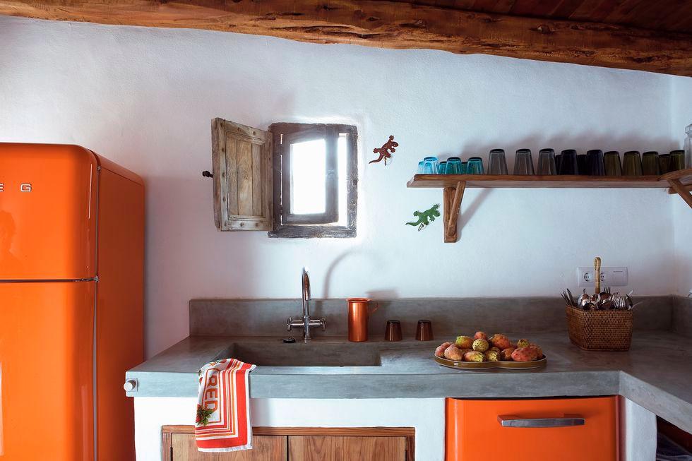 De igual forma, la cocina se ha realizado de obra con acabado en cemento pulido y además, responde a los cánones de la arquitectura local de la isla. Con las vigas originales restauradas, se le ha dado más calidez. Cemento pulido que también se ha utilizado para realizar los muebles del baño (lavabos y encimeras) y que se mimetiza con el suelo y las paredes.
