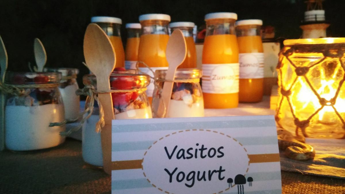 El menú, como os decíamos fue muy sencillo: volovanes variados de salmón, anchoas, cangrejo… tostas de jamón con tomate y aceite y tartaletas de guacamole con pollo ¡¡todo para chuparse los dedos!! pero lo que realmente triunfó fueron los vasitos de yogurt con cereales y arándanos y frambuesas… una auténtica delicia!!