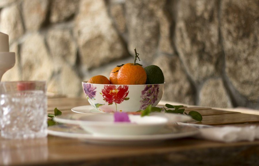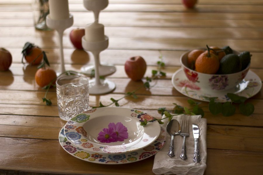2. Una vez decidido los colores y el estilo podemos apostar por poner algo de atrezzo. Podemos recurrir a jarrones que tengamos por casa, a flores frescas, frutos de temporada... Aunque luego lo tengamos que retirar para comer, a primera vista nuestra mesa va a lucir mucho más bonita.