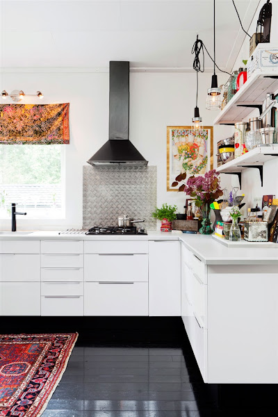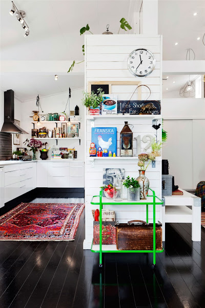 Yo no soy muy amigo de tantos colores, me gusta que estén un poco mas "controlados", pero hay que admitir que a esta pequeña casa le quedan verdaderamente bien. Plantas, libros, muebles, fotografías, adornos, utensilios, alfombras, cojines... todo pone de su parte para que el color no falte en ningún rincón de esta casa. Si os fijáis bien los colores resaltan gracias a la elección del blanco y el negro como base, y es que se cumple perfectamente la técnica cromáticadel 60-30-10 para conseguir un equilibrio. El 60 seria el blanco de techo, paredes y algún que otro objeto del mobiliario, el 30 seria el negro del suelo (que queda espectacular) y de algunos otros elementos como el sofá o la chimenea, y el 10 serian el resto de los colores. Normalmente se suele elegir uno o dos como mucho pero creo que en esta casa no han podido decidirse por un solo y han preferido poner todo, eso si de una forma muy equilibrada.