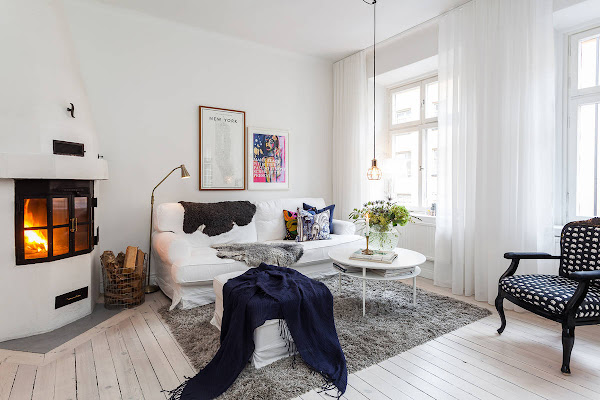 ¿No os parece ideal este saloncito con su preciosa chimenea? Me imagino que si porque a mi me ha conquistado. Y es que he elegido este bonito piso de estilo nórdico para visitarlo hoy en el blog precisamente por ese detalle, su preciosa chimenea.