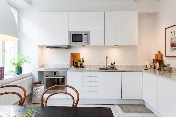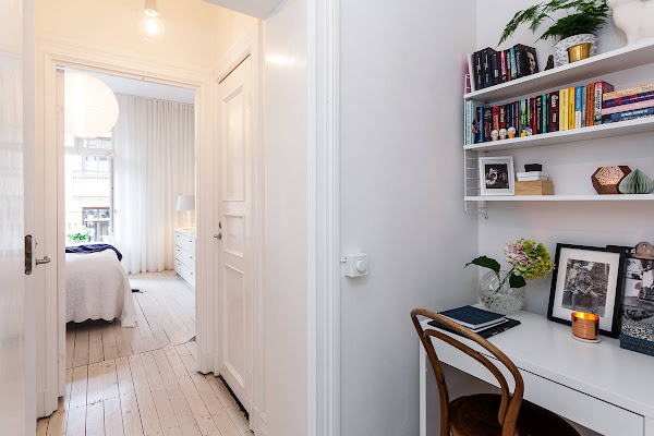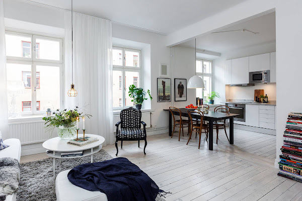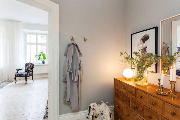 De todas formas la chimenea no es lo único que me ha gustado de este piso de estilo nórdico. Por ejemplo uno de los detalles que mas me han llamado la atención es el mueble cajonera que está en el recibidor. ¡Que vida y que fuerza le da a ese rincón!. Cuando la mirada se te va siempre a un mueble es porque este está cumpliendo muy bien su misión, en este caso llamar la atención hacia una pieza tan interesante como es el. Otro de los detalles con los que me quedo es el uso de la mesa de comedor como separador de ambientes. Sirve perfectamente de transición entre la cocina y el salón, y a su vez sirve de "isla" para la cocina. Vamos una solución muy buena.
