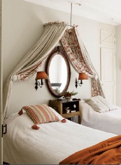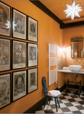 Los dormitorios en la planta de arriba, son de estilo clásico, con dosel sobre las camas que les confieren un aspecto refinado, reforzados por los detalles vintage de retratos, mesitas de noche, etc. Ideas muy interesantes de solucionar las habitaciones para unas unidades de estancia espectaculares donde se hace especial hincapié en el refuerzo visual con los espejos, las almohadas, los dorados... para dormir como un rey!. El cuarto de baño es muy gráfico, con las fotogtrafías decorando la pared. Una combinación de estilos con el naranja de fondo.